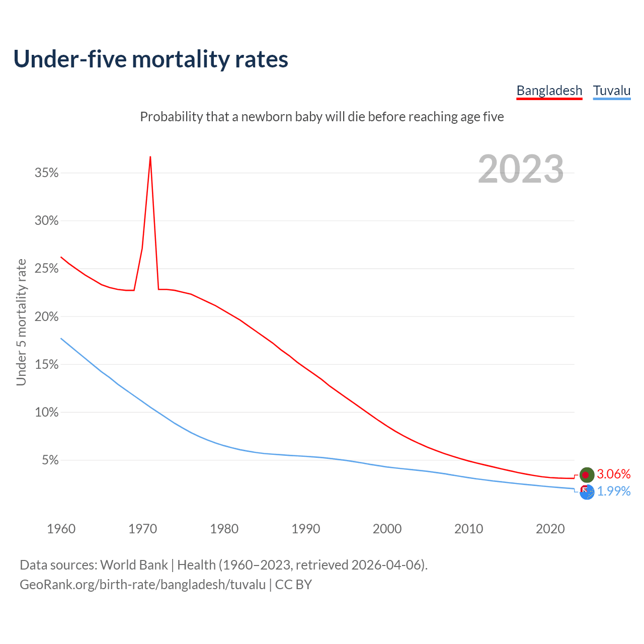 The chance that a newborn baby will die before reaching age five is 3.06% in Bangladesh and 1.99% in Tuvalu. Above is a chart with historical data on under-five mortality rates.