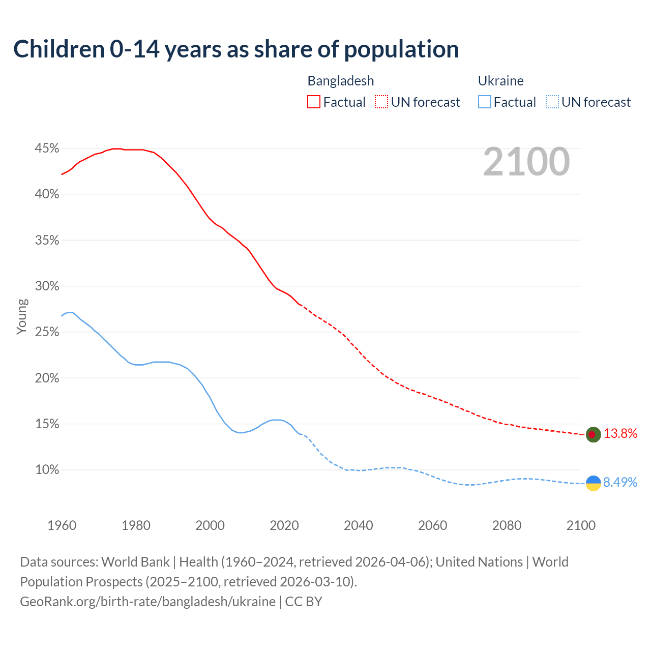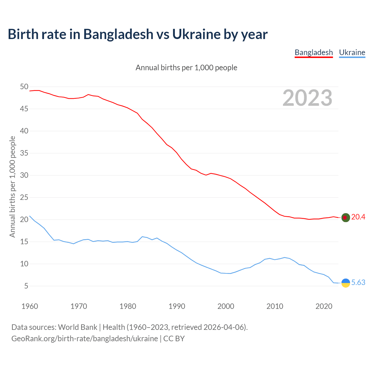 Bangladesh has an annual birth rate of 20.4 births per 1,000 people, compared to 5.63 for Ukraine. The average number of children a woman is expected to have during her lifetime — the fertility rate, is 2.16 in Bangladesh and 0.98 in Ukraine — 54.8% difference.