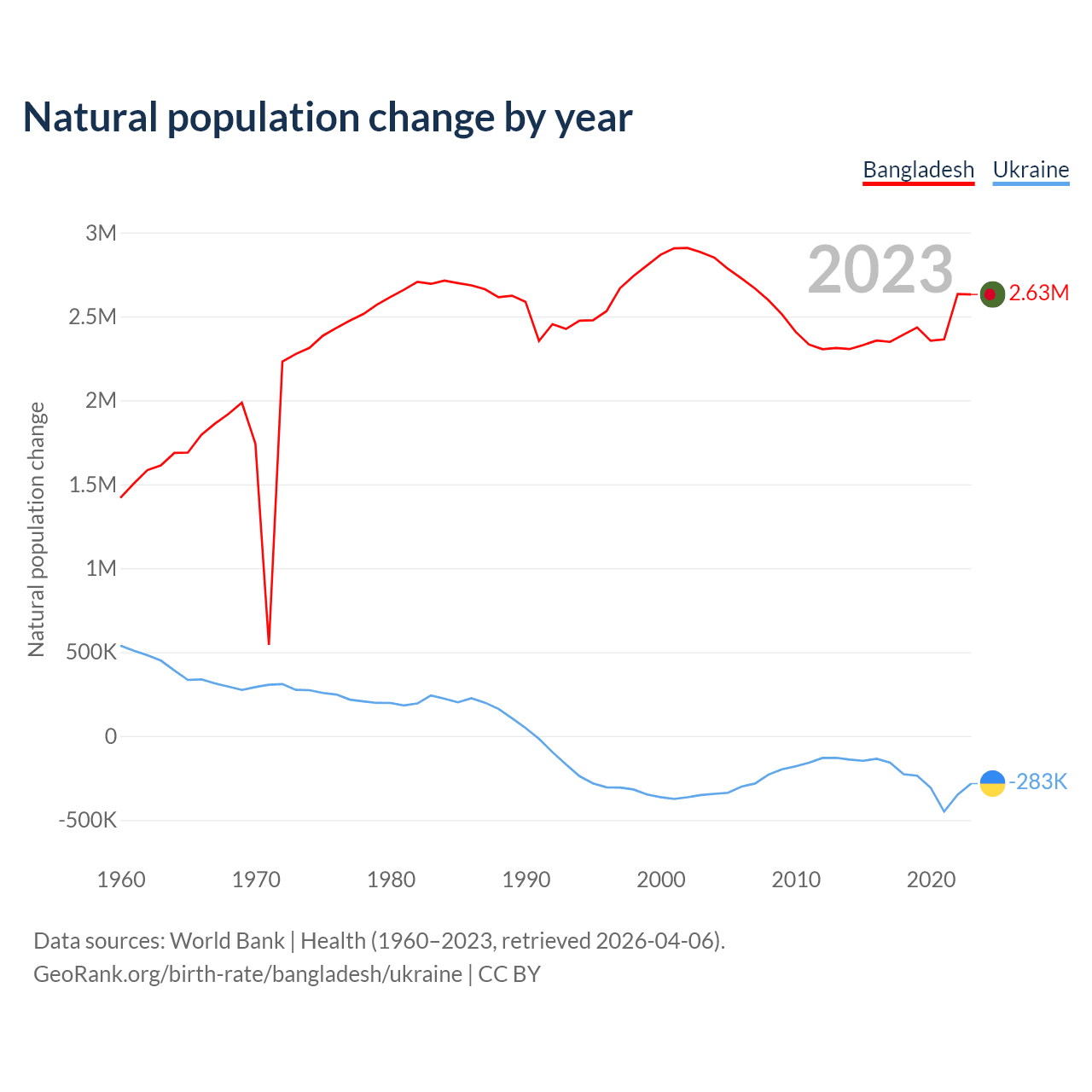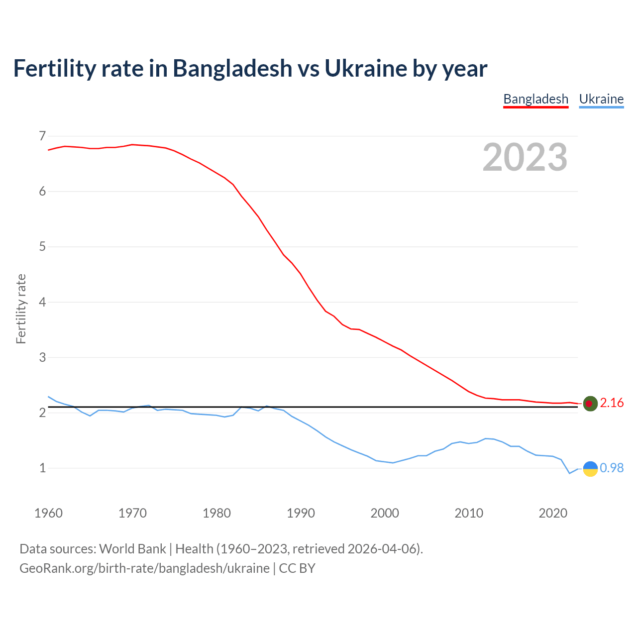 According to the latest available data on birth rates, the fertility rate in Bangladesh was 2.16 children per woman in 2023, compared to 0.98 in Ukraine in 2023. The replacement level is considered to be 2.1 children per woman.
