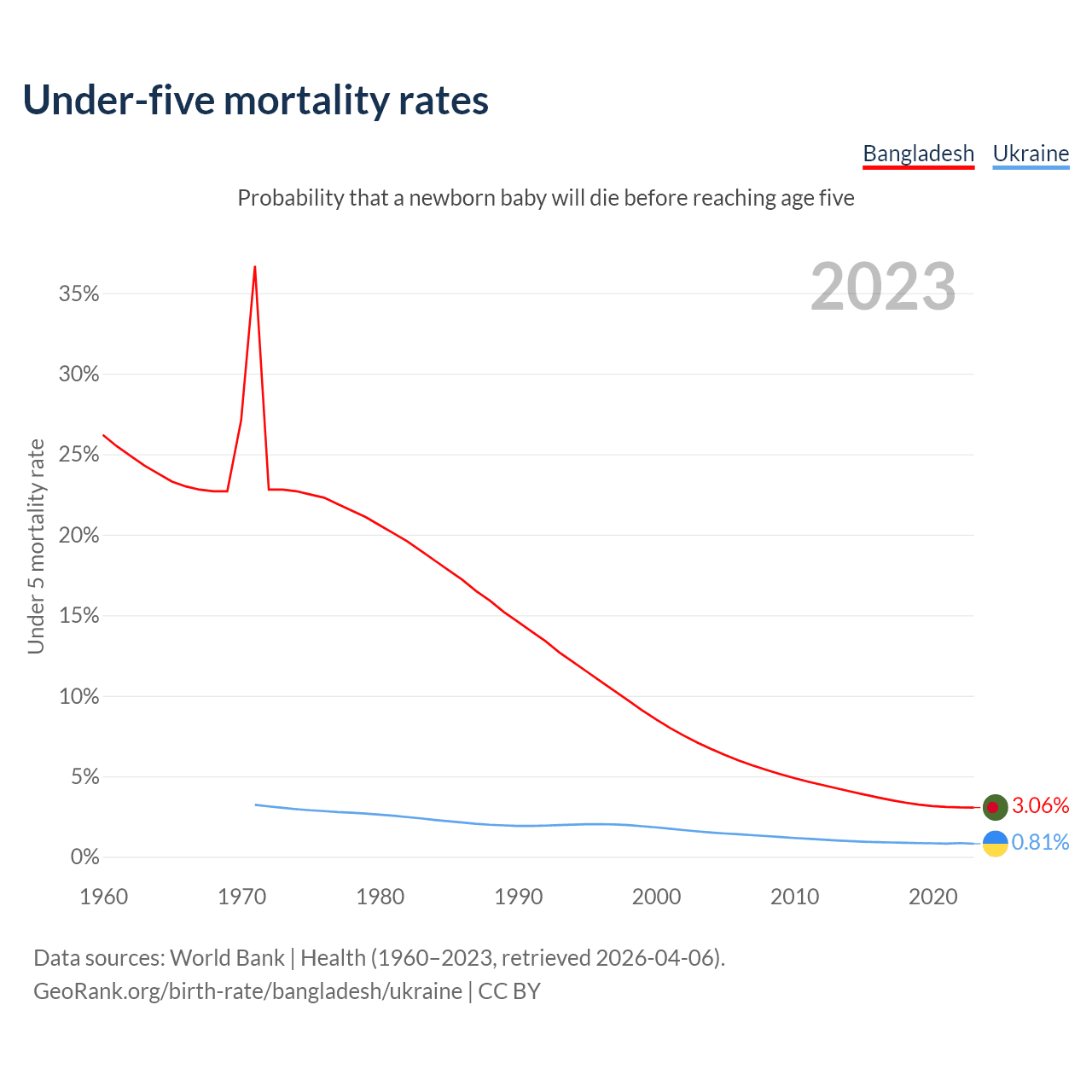 The chance that a newborn baby will die before reaching age five is 3.06% in Bangladesh and 0.81% in Ukraine. Above is a chart with historical data on under-five mortality rates.