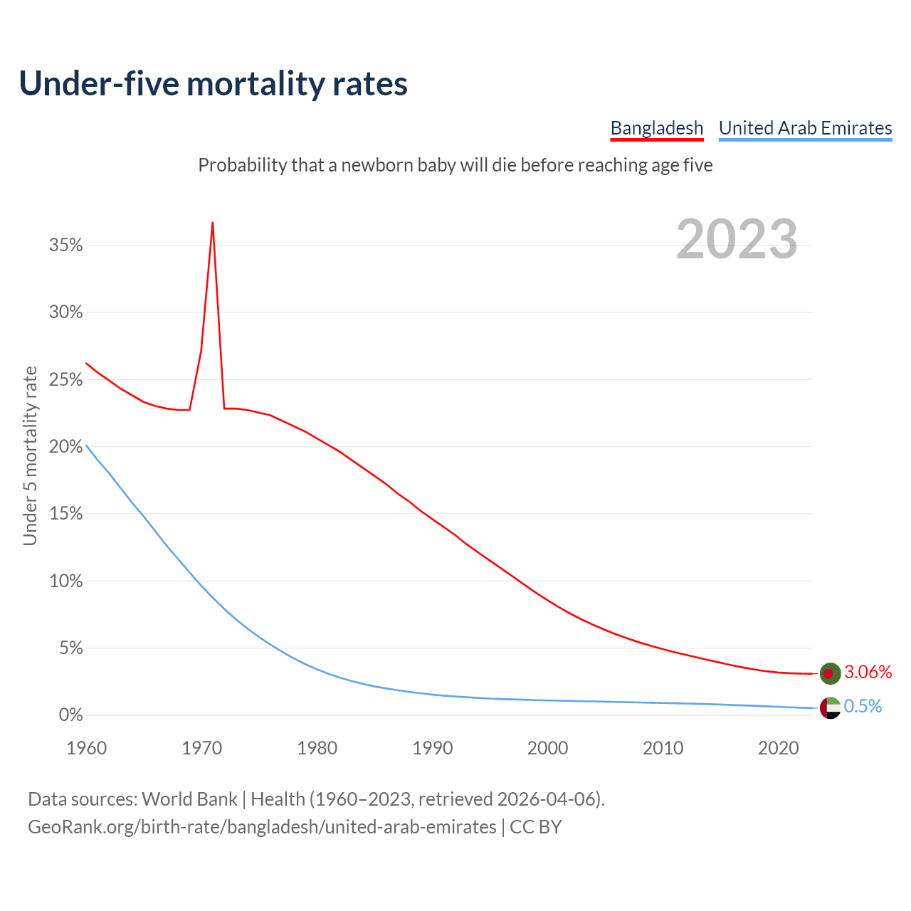 The chance that a newborn baby will die before reaching age five is 3.06% in Bangladesh and 0.5% in the United Arab Emirates. Above is a chart with historical data on under-five mortality rates.