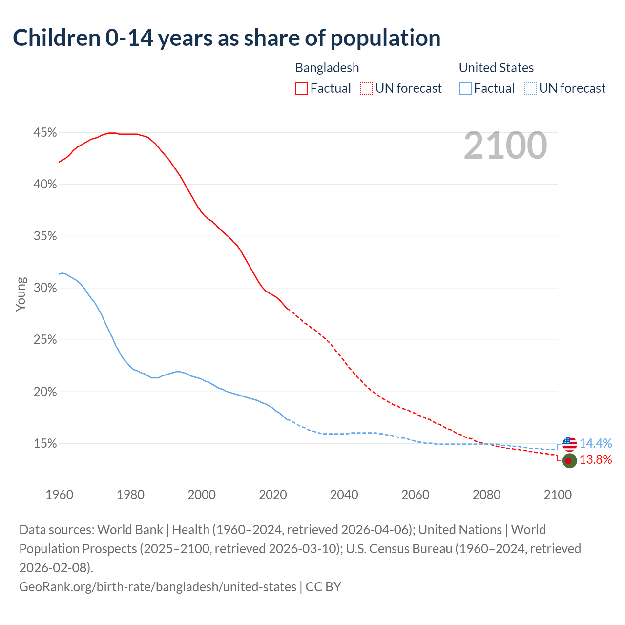 According to the latest available data on birth rates, the fertility rate in Bangladesh was 2.16 children per woman in 2023, compared to 1.62 in the United States in 2023. The replacement level is considered to be 2.1 children per woman.