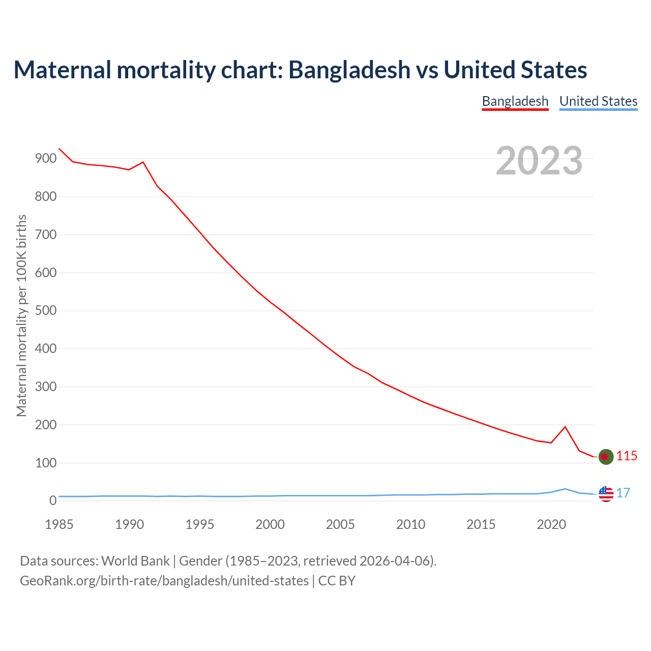 The maternal mortality rate, which is the probability of dying during childbirth or within 42 days of pregnancy termination, is 115 deaths per 100,000 live births in Bangladesh, compared to 17 deaths in the United States.