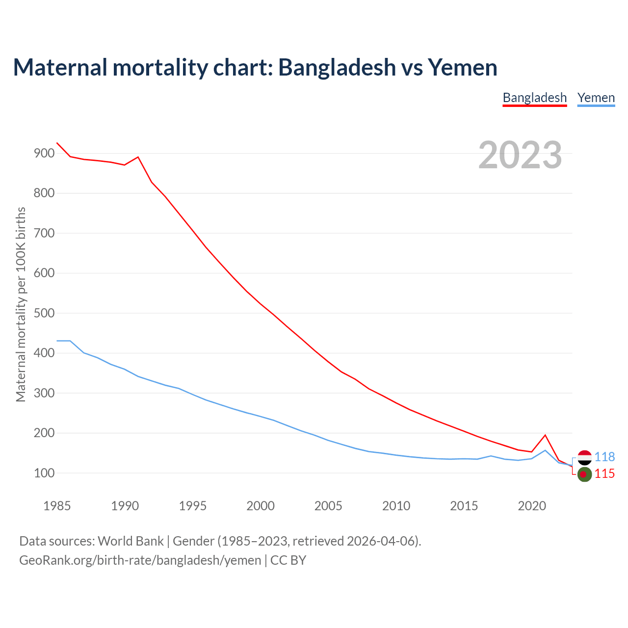 The maternal mortality rate, which is the probability of dying during childbirth or within 42 days of pregnancy termination, is 115 deaths per 100,000 live births in Bangladesh, compared to 118 deaths in Yemen.