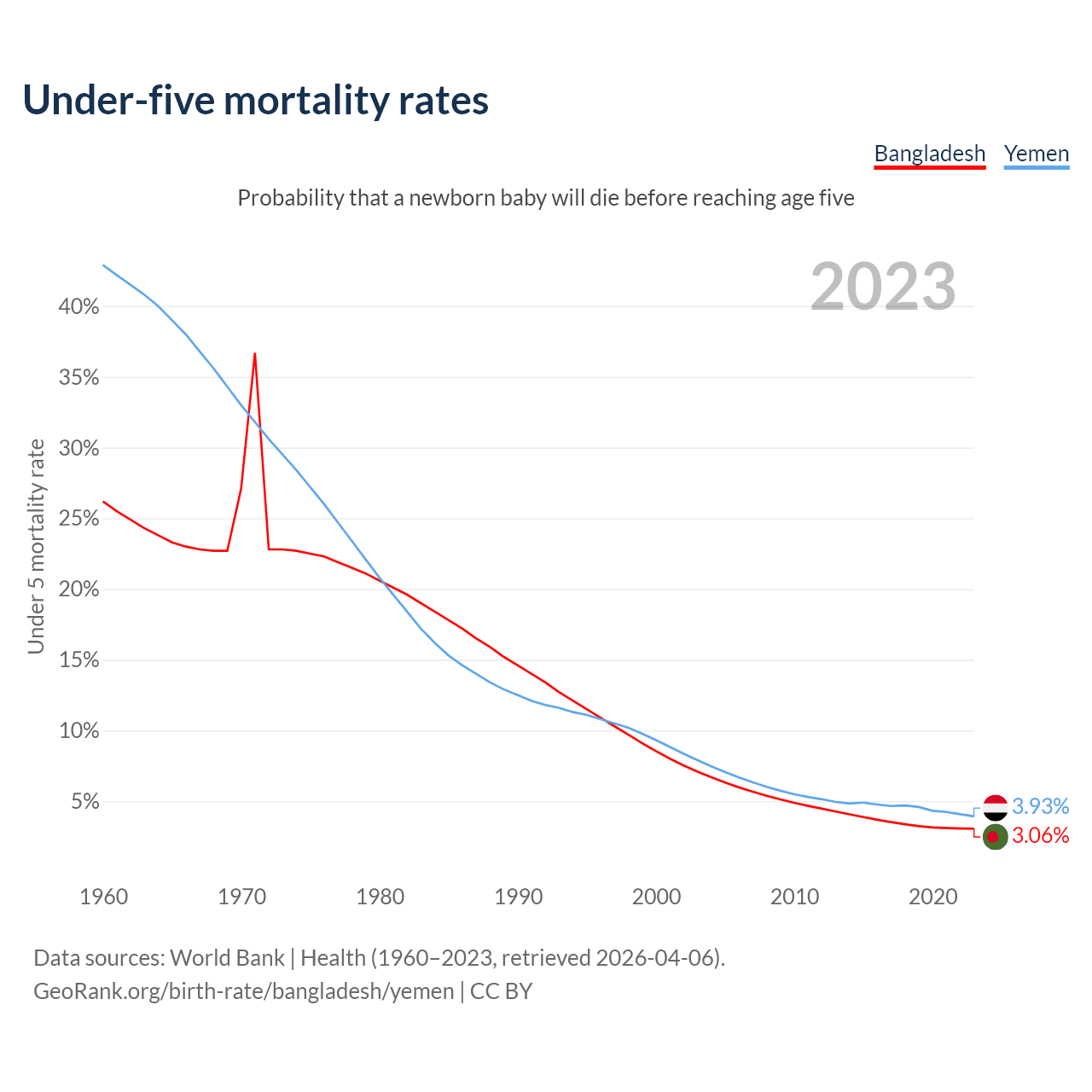 The chance that a newborn baby will die before reaching age five is 3.06% in Bangladesh and 3.93% in Yemen. Above is a chart with historical data on under-five mortality rates.