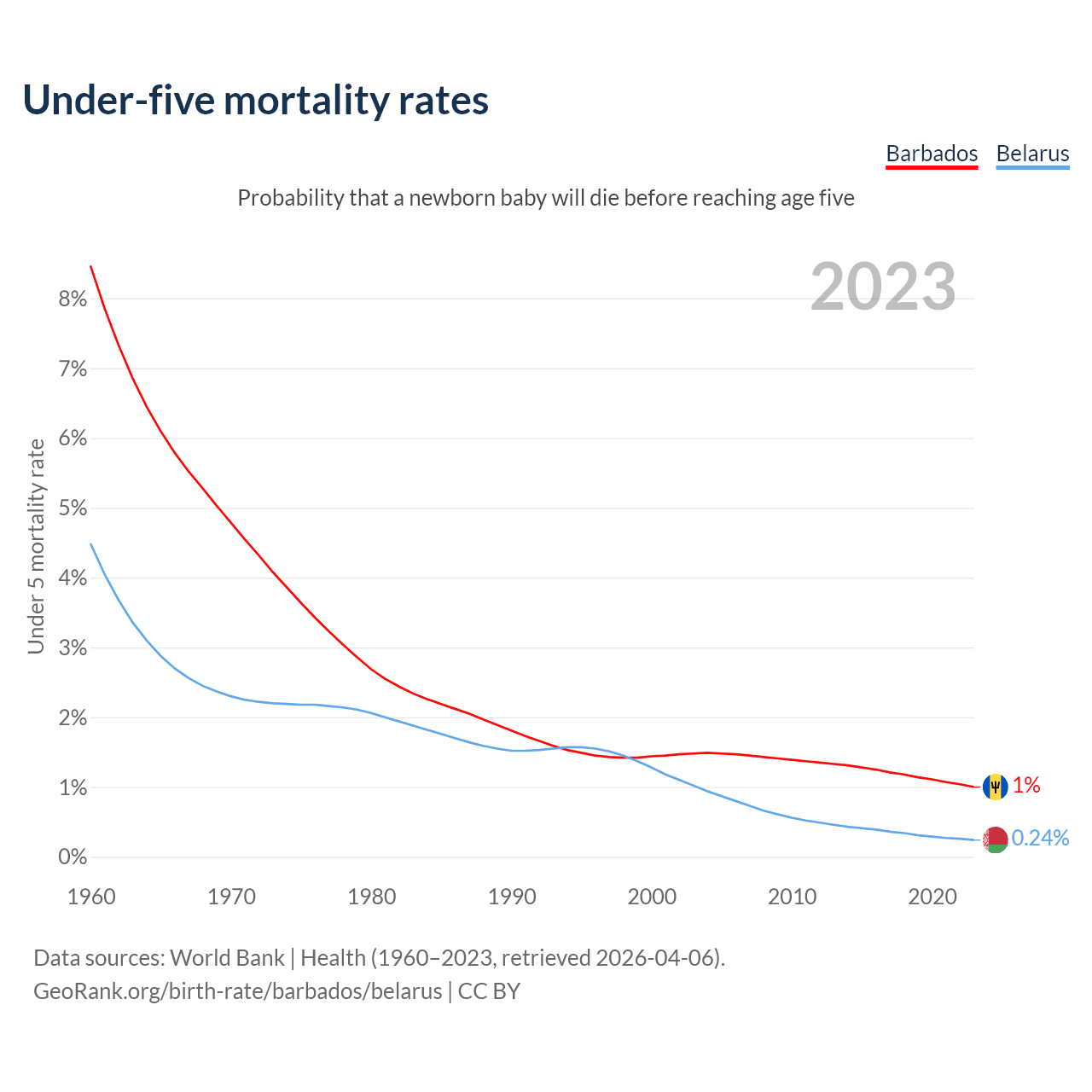 The chance that a newborn baby will die before reaching age five is 1% in Barbados and 0.24% in Belarus. Above is a chart with historical data on under-five mortality rates.