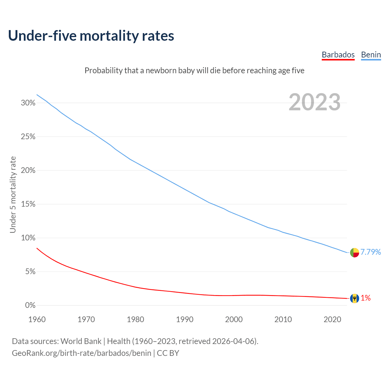 The chance that a newborn baby will die before reaching age five is 1% in Barbados and 7.79% in Benin. Above is a chart with historical data on under-five mortality rates.