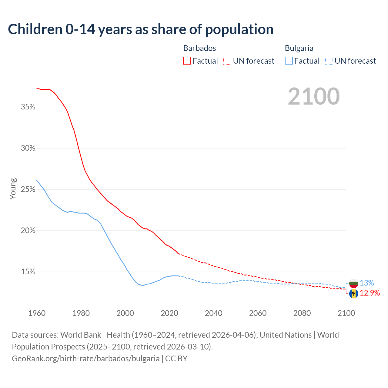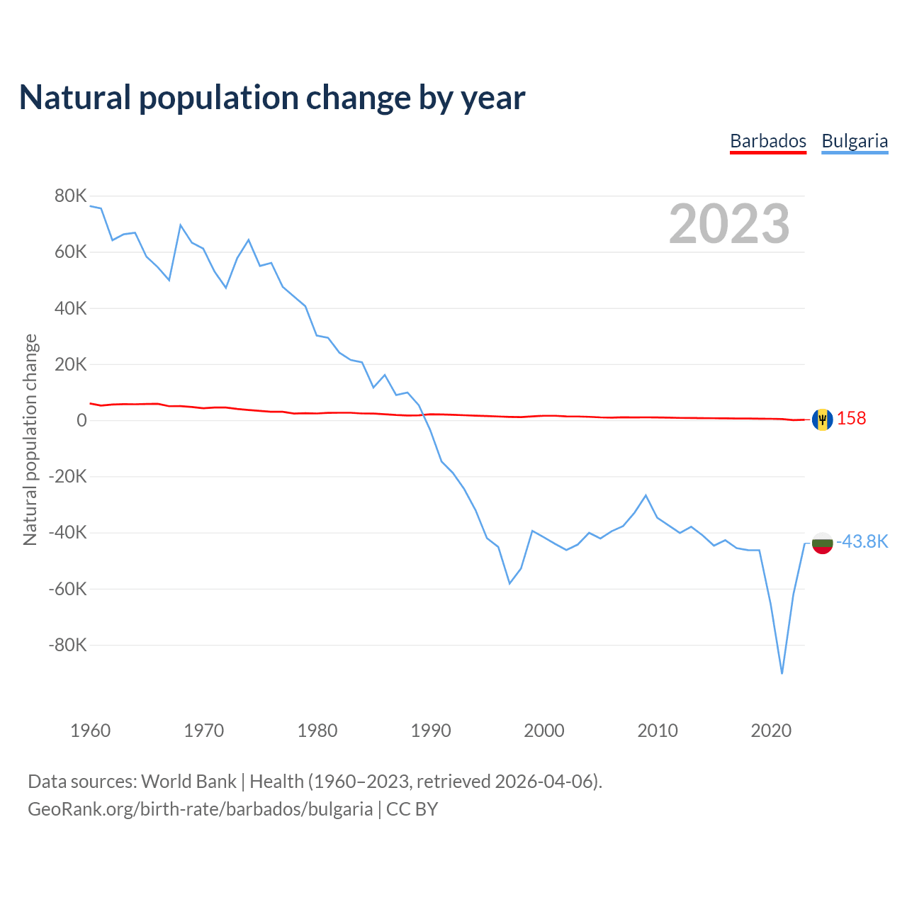 According to the latest available data on birth rates, the fertility rate in Barbados was 1.71 children per woman in 2023, compared to 1.81 in Bulgaria in 2023. The replacement level is considered to be 2.1 children per woman.