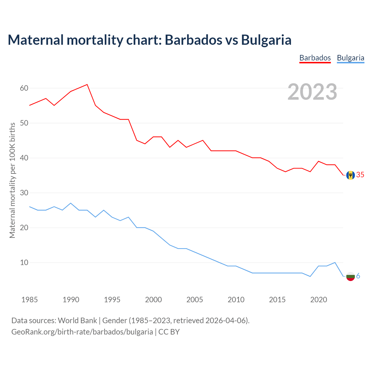 The maternal mortality rate, which is the probability of dying during childbirth or within 42 days of pregnancy termination, is 35 deaths per 100,000 live births in Barbados, compared to 6 deaths in Bulgaria.