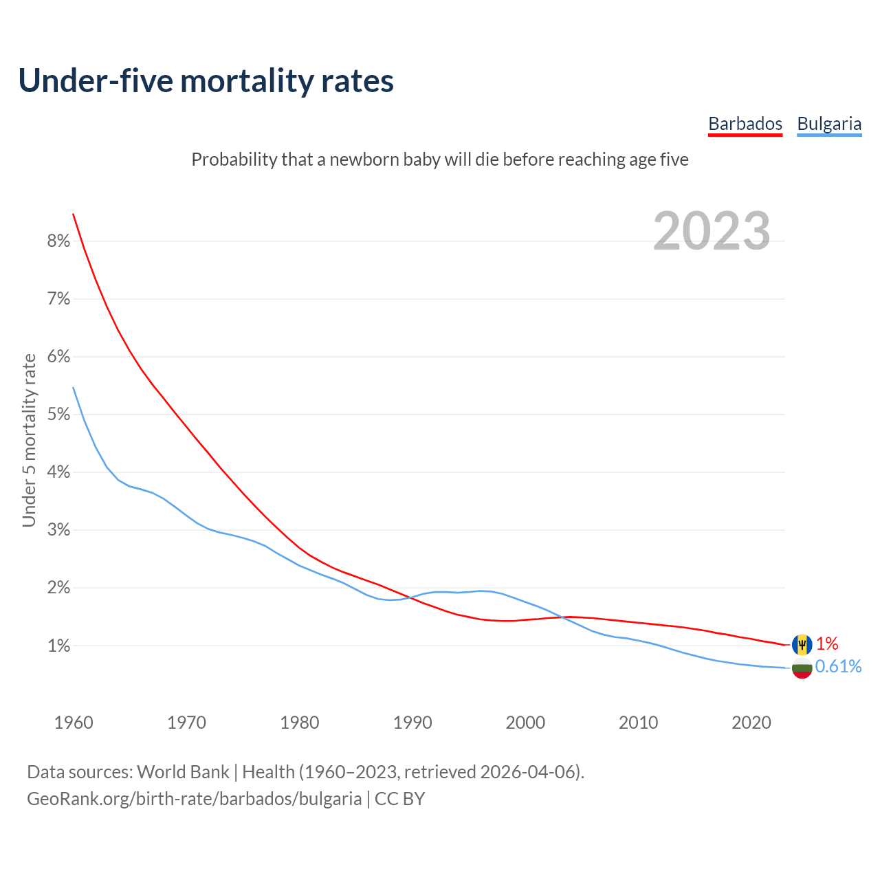 The chance that a newborn baby will die before reaching age five is 1% in Barbados and 0.61% in Bulgaria. Above is a chart with historical data on under-five mortality rates.