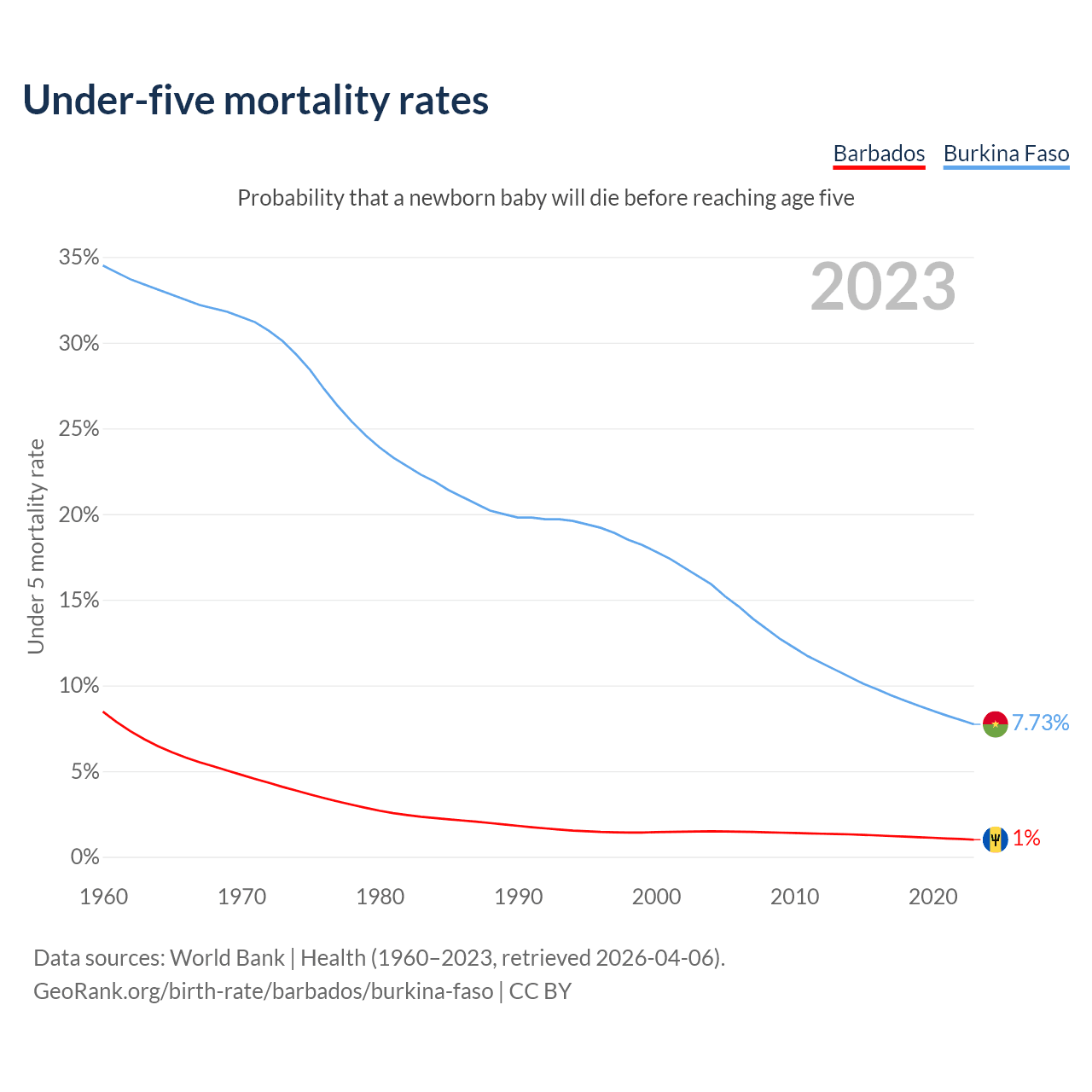 The chance that a newborn baby will die before reaching age five is 1% in Barbados and 7.73% in Burkina Faso. Above is a chart with historical data on under-five mortality rates.