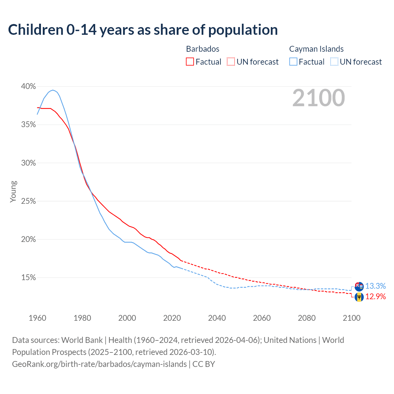 Children aged 0-14 make up 17.2% of the population in Barbados and 16.2% in the Cayman Islands in 2024, compared to 24.2% and 22.3% respectively in 1990.