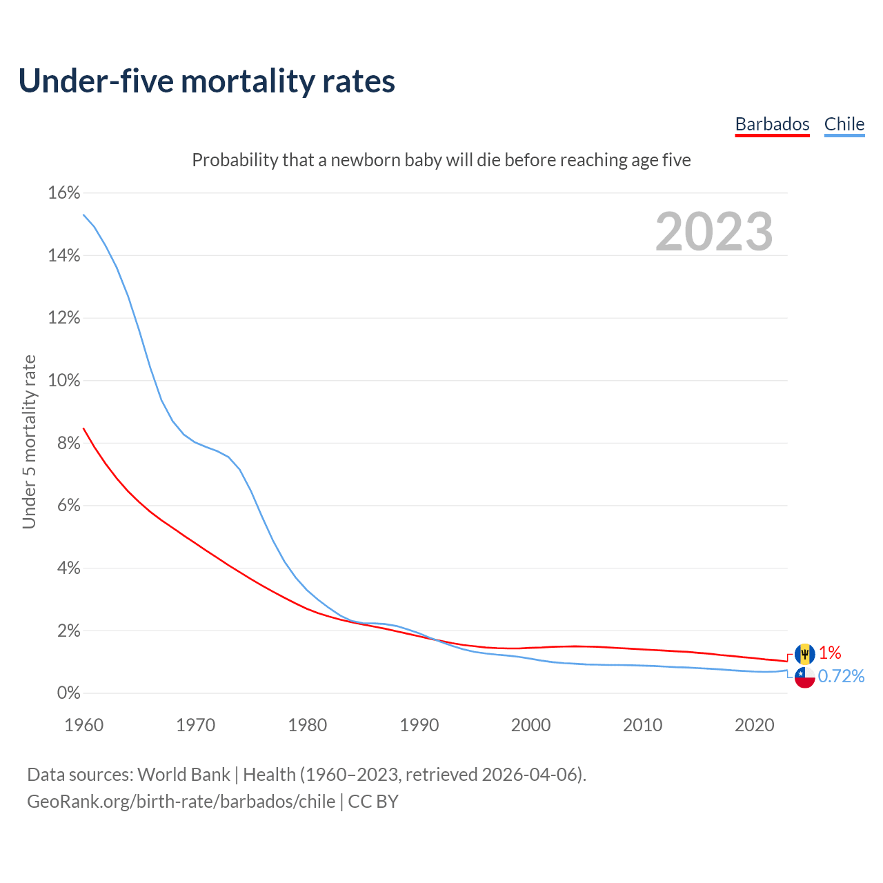 The chance that a newborn baby will die before reaching age five is 1% in Barbados and 0.72% in Chile. Above is a chart with historical data on under-five mortality rates.