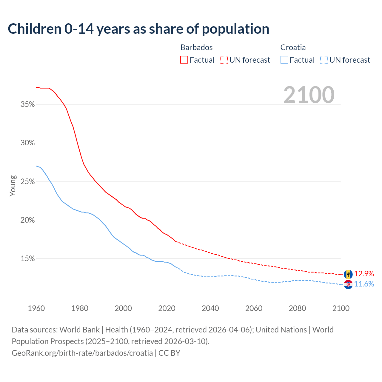 According to the latest available data on birth rates, the fertility rate in Barbados was 1.71 children per woman in 2023, compared to 1.46 in Croatia in 2023. The replacement level is considered to be 2.1 children per woman.