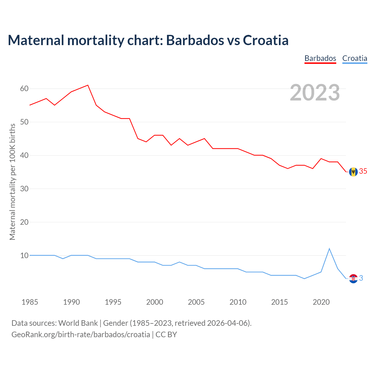 The maternal mortality rate, which is the probability of dying during childbirth or within 42 days of pregnancy termination, is 35 deaths per 100,000 live births in Barbados, compared to 3 deaths in Croatia.