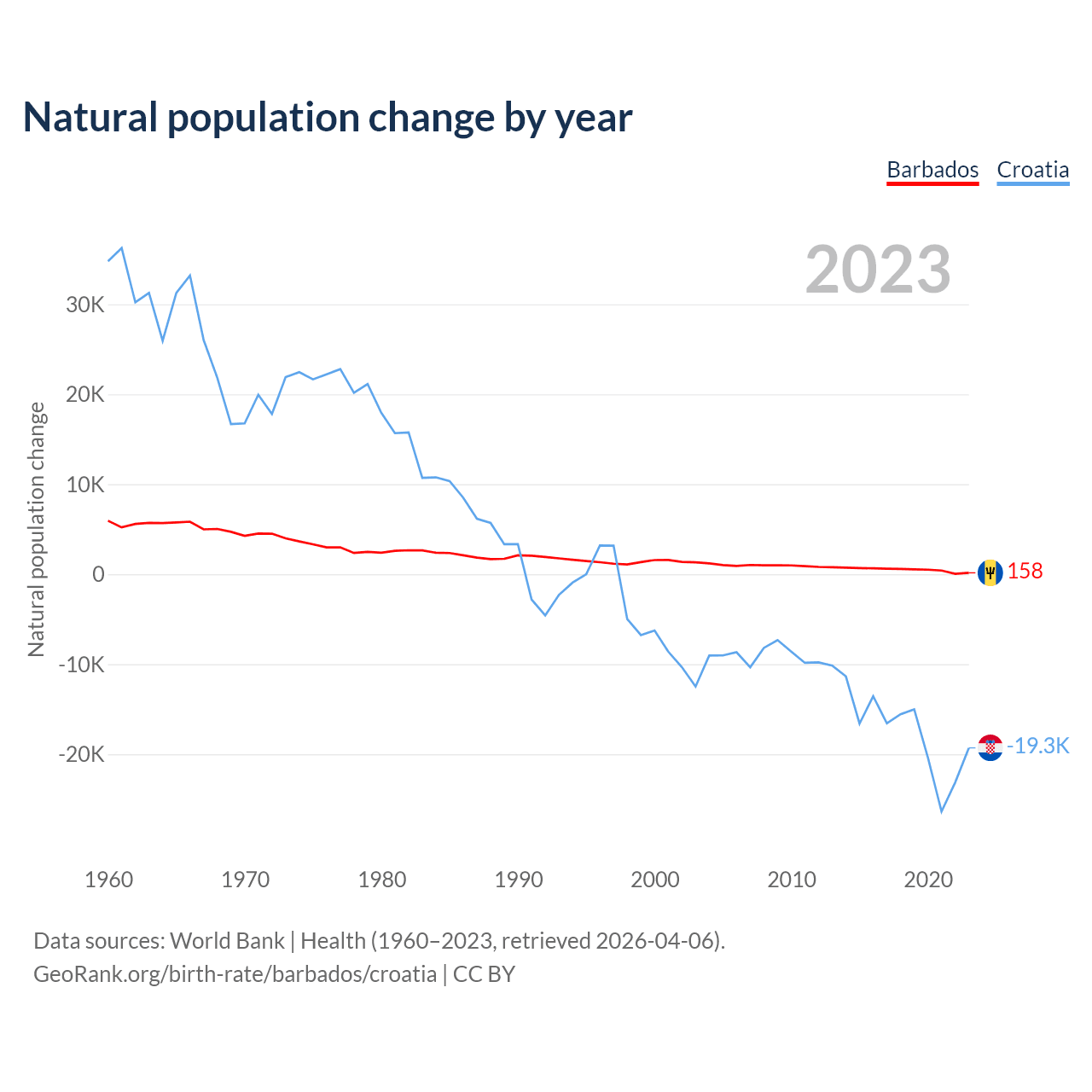 - Barbados is ranked 127/196 by birth rate compared to 171/196 for Croatia.