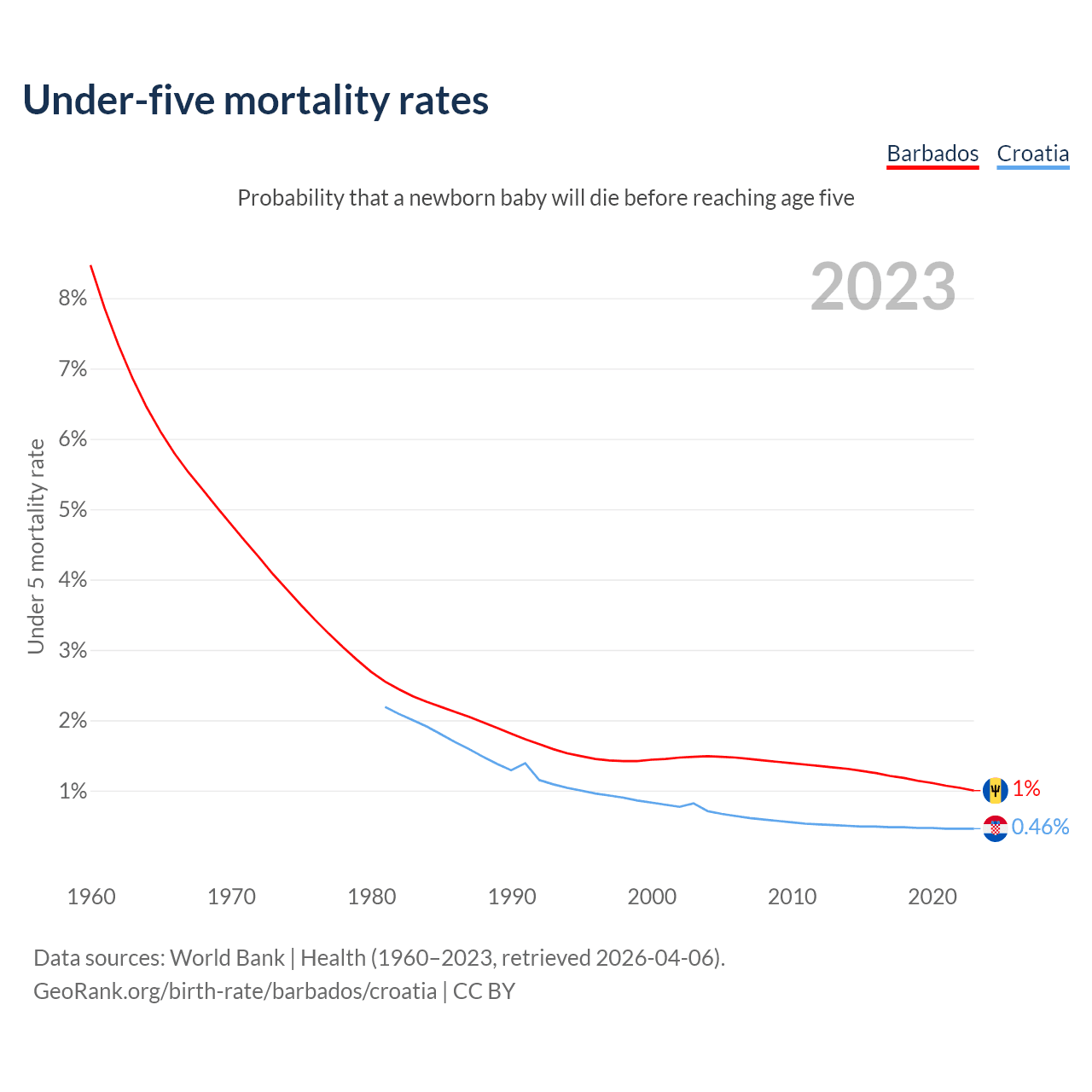 The chance that a newborn baby will die before reaching age five is 1% in Barbados and 0.46% in Croatia. Above is a chart with historical data on under-five mortality rates.