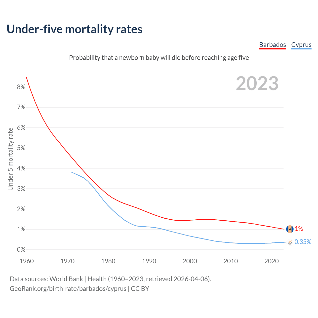 The chance that a newborn baby will die before reaching age five is 1% in Barbados and 0.35% in Cyprus. Above is a chart with historical data on under-five mortality rates.