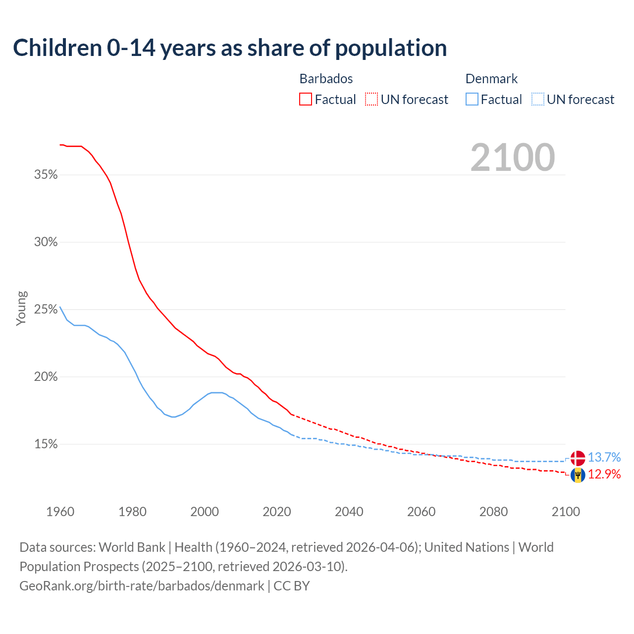 According to the latest available data on birth rates, the fertility rate in Barbados was 1.71 children per woman in 2023, compared to 1.5 in Denmark in 2023. The replacement level is considered to be 2.1 children per woman.