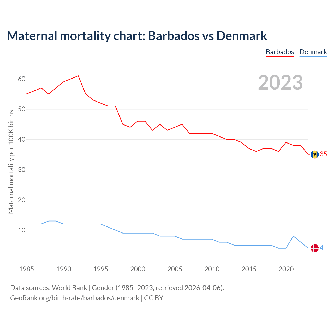 The maternal mortality rate, which is the probability of dying during childbirth or within 42 days of pregnancy termination, is 35 deaths per 100,000 live births in Barbados, compared to 4 deaths in Denmark.