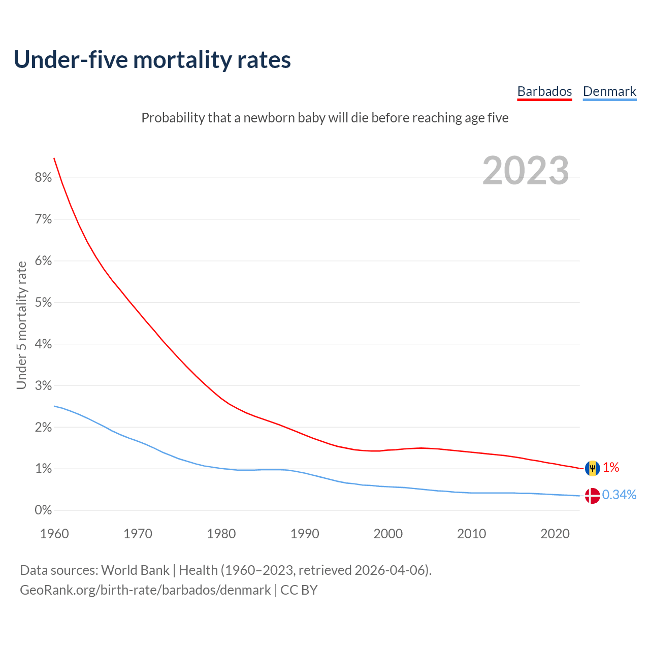 The chance that a newborn baby will die before reaching age five is 1% in Barbados and 0.34% in Denmark. Above is a chart with historical data on under-five mortality rates.