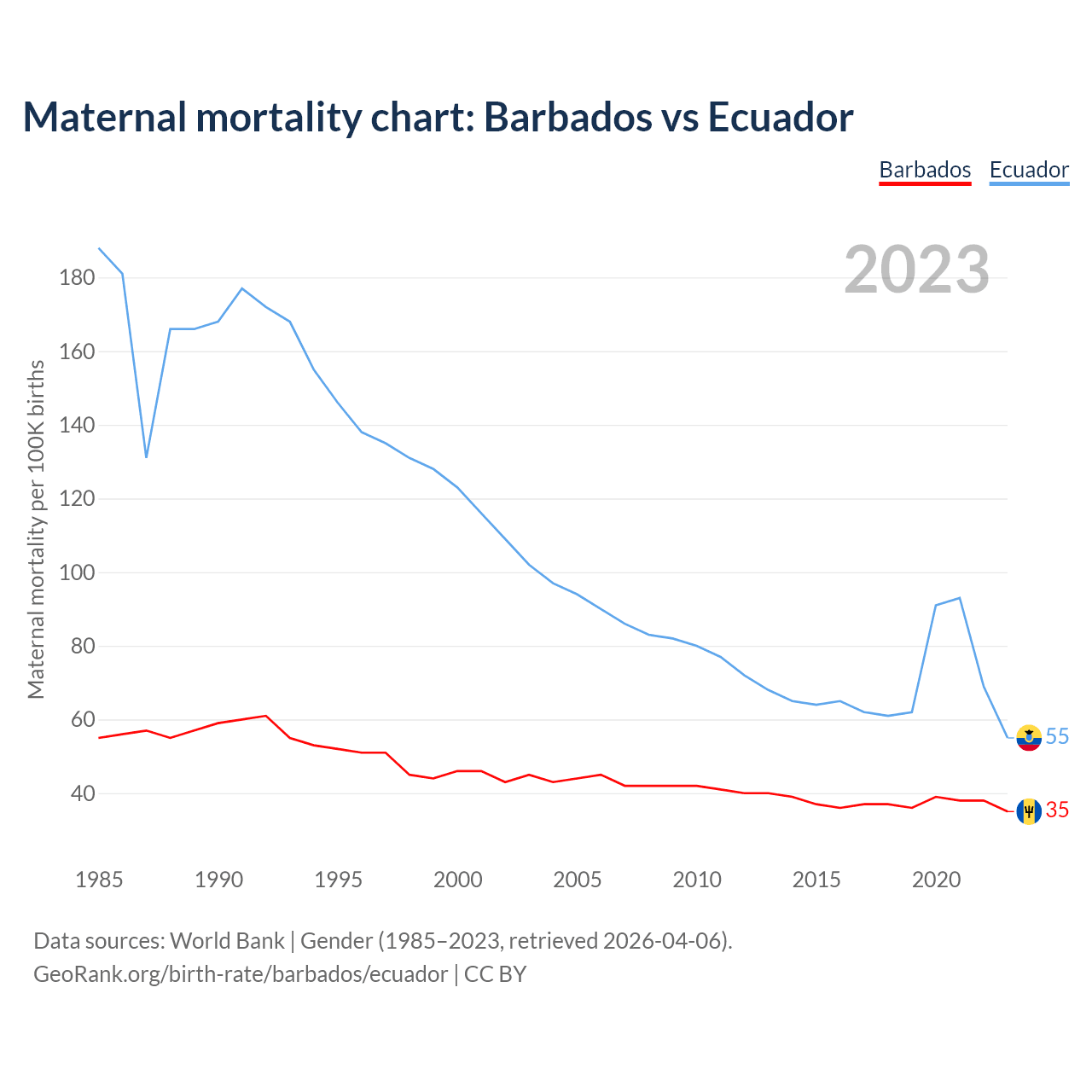 The maternal mortality rate, which is the probability of dying during childbirth or within 42 days of pregnancy termination, is 35 deaths per 100,000 live births in Barbados, compared to 55 deaths in Ecuador.