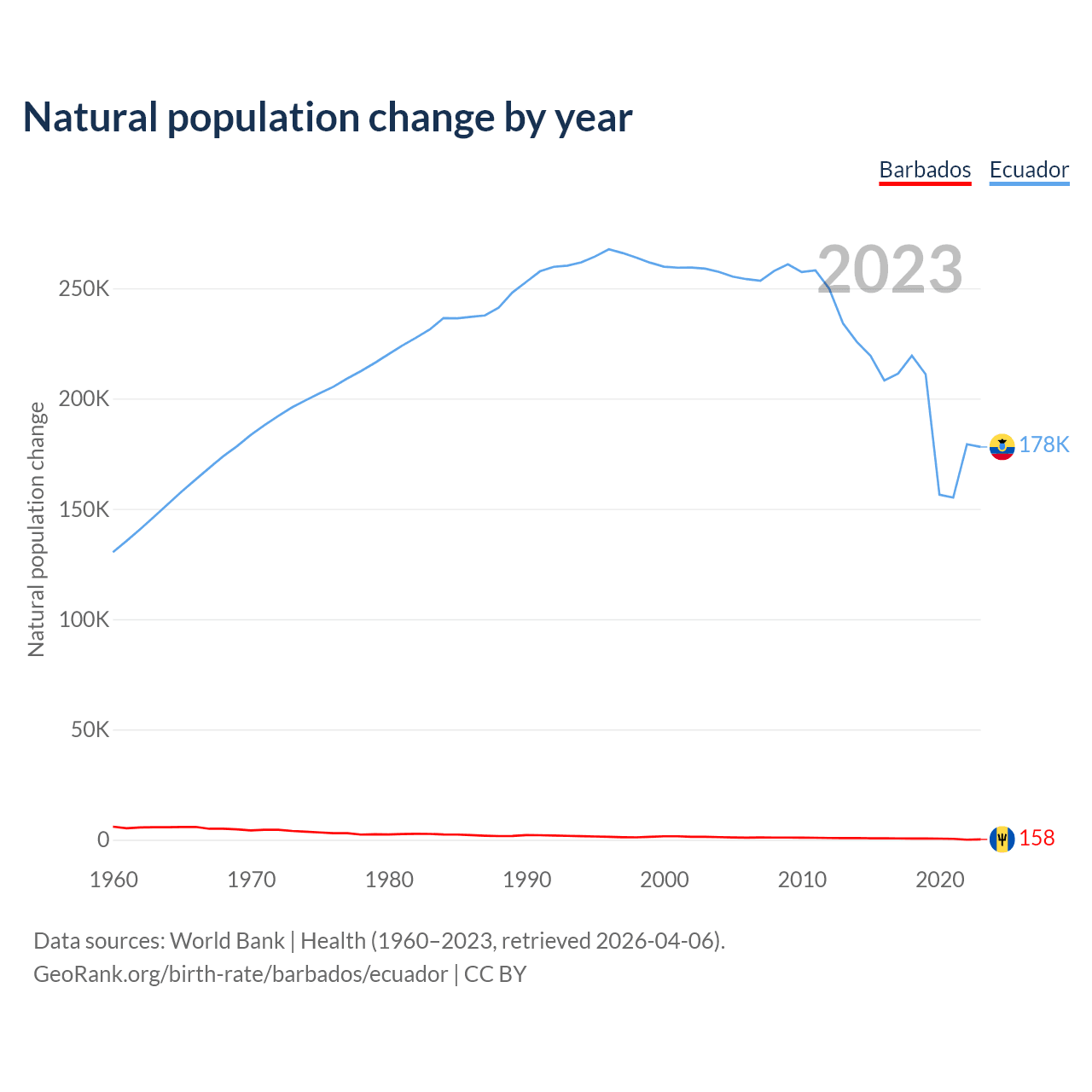 According to the latest available data on birth rates, the fertility rate in Barbados was 1.71 children per woman in 2023, compared to 1.82 in Ecuador in 2023. The replacement level is considered to be 2.1 children per woman.
