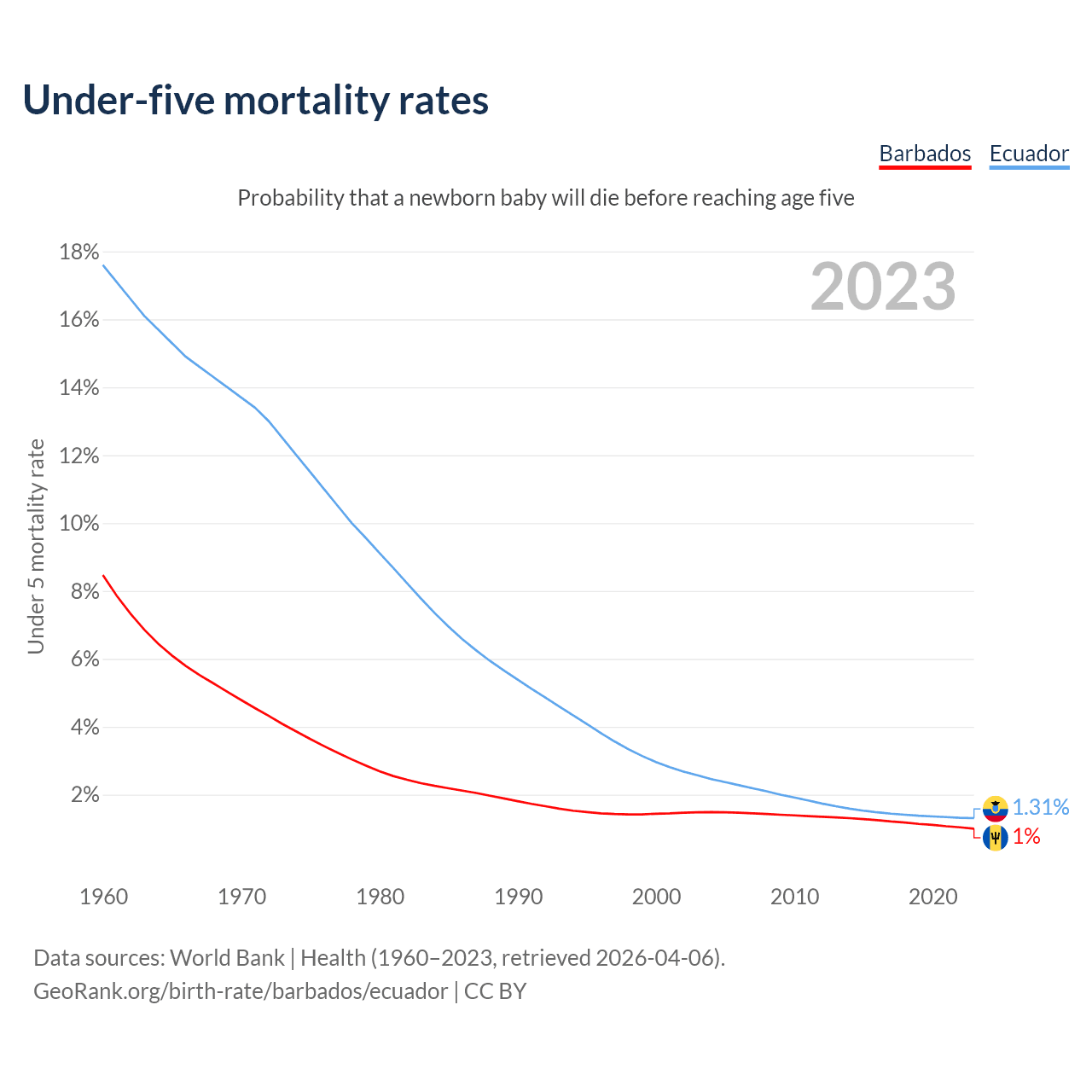 The chance that a newborn baby will die before reaching age five is 1% in Barbados and 1.31% in Ecuador. Above is a chart with historical data on under-five mortality rates.