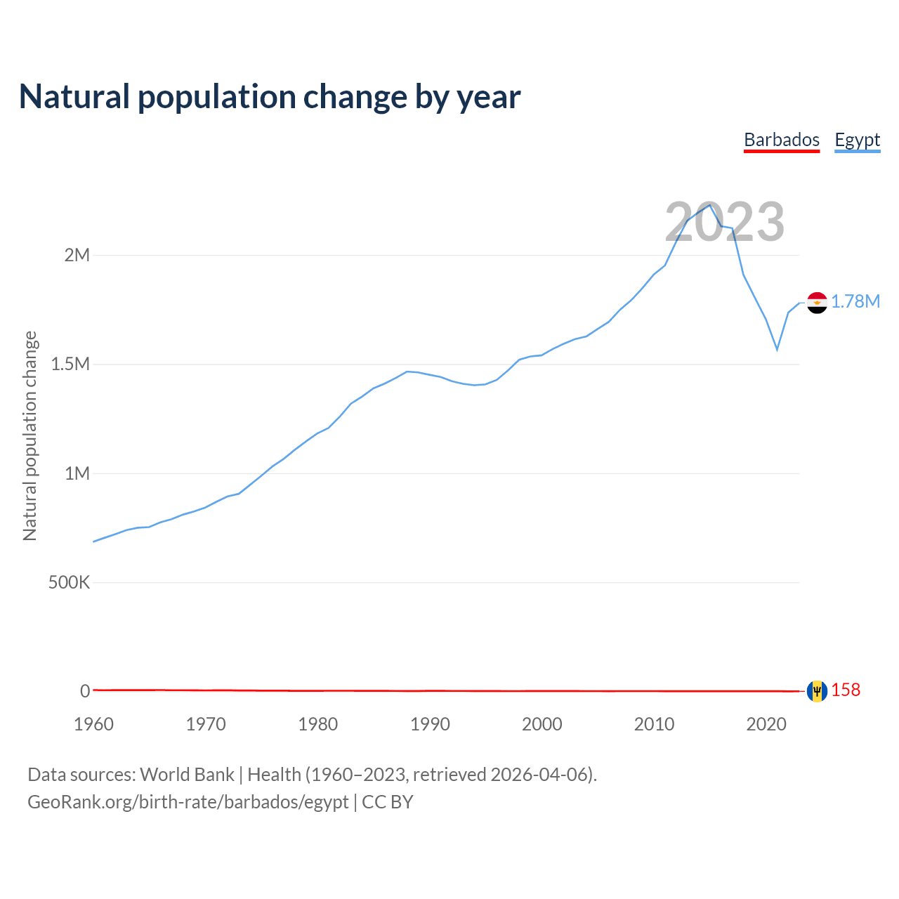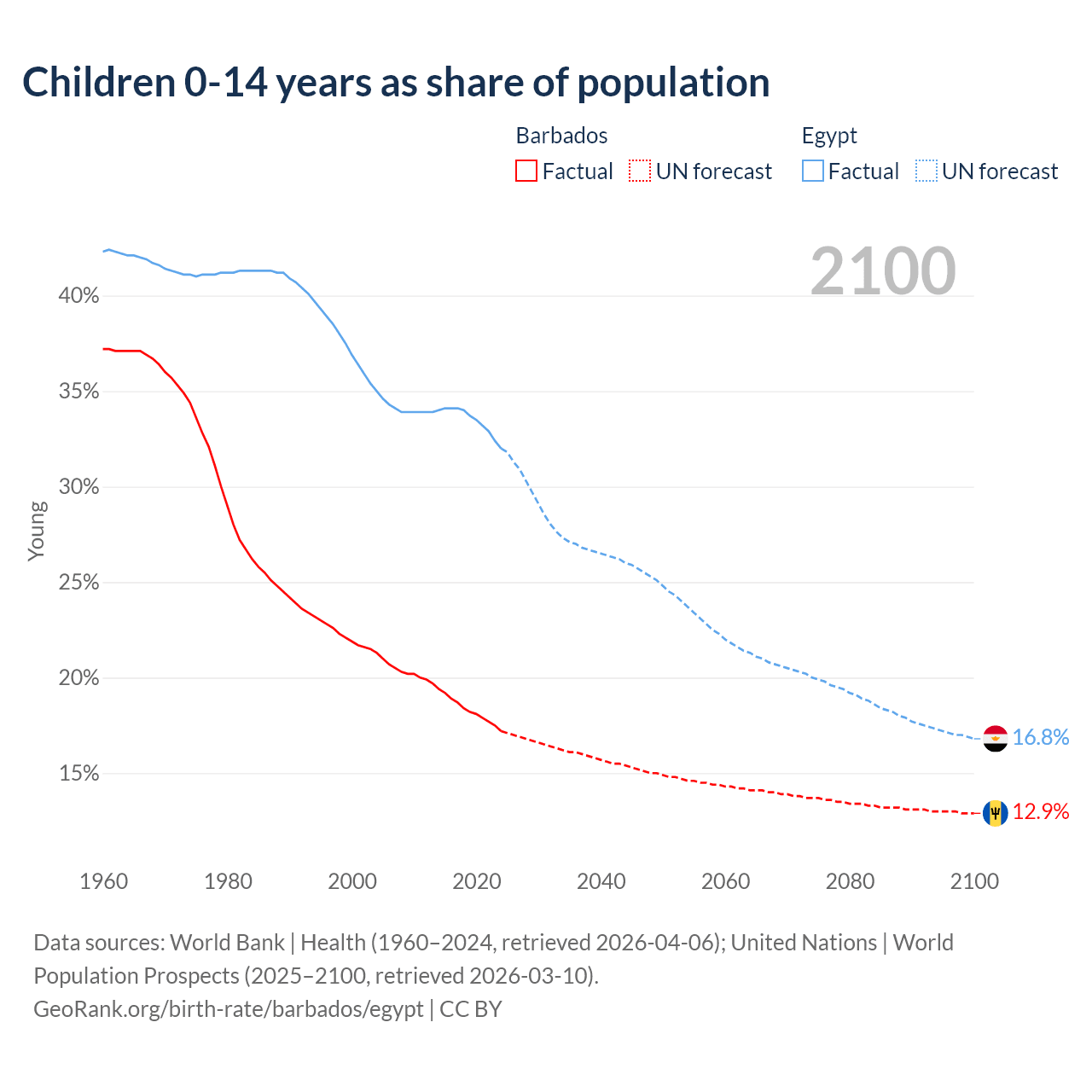 According to the latest available data on birth rates, the fertility rate in Barbados was 1.71 children per woman in 2023, compared to 2.75 in Egypt in 2023. The replacement level is considered to be 2.1 children per woman.