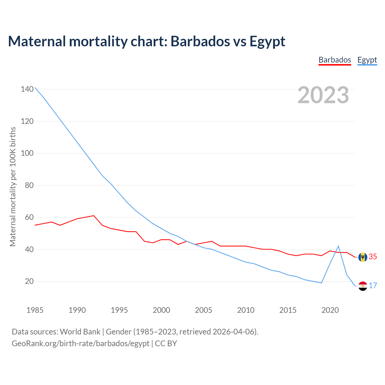 The maternal mortality rate, which is the probability of dying during childbirth or within 42 days of pregnancy termination, is 35 deaths per 100,000 live births in Barbados, compared to 17 deaths in Egypt.