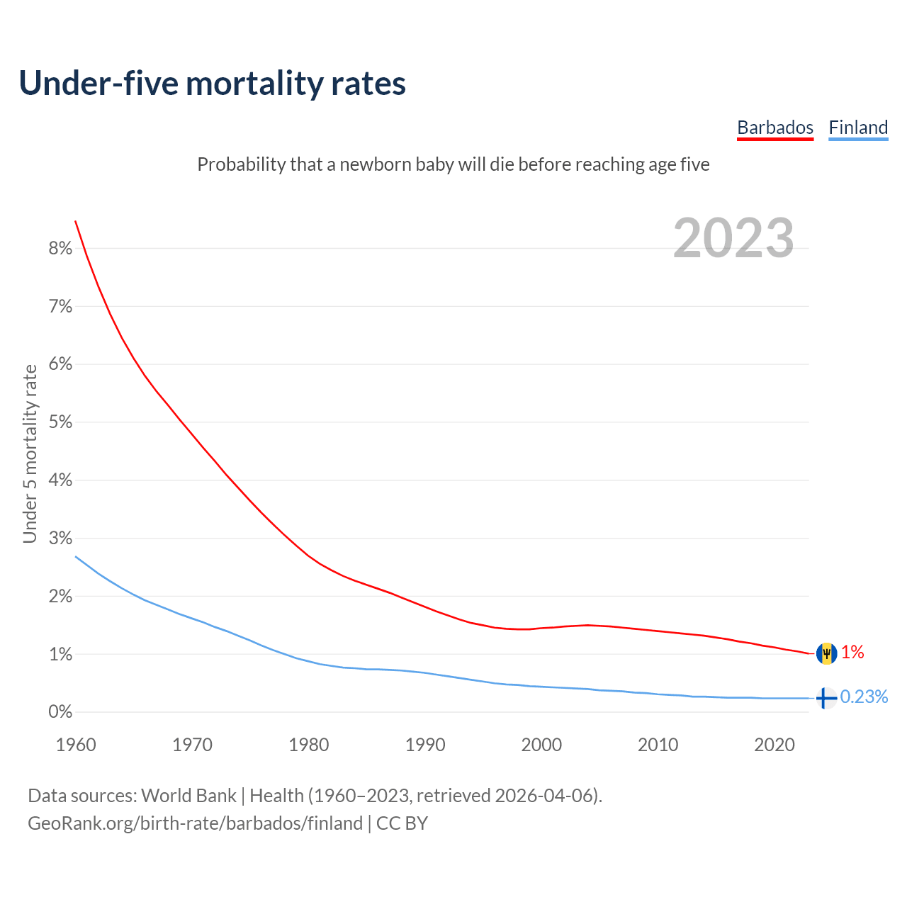 The chance that a newborn baby will die before reaching age five is 1% in Barbados and 0.23% in Finland. Above is a chart with historical data on under-five mortality rates.