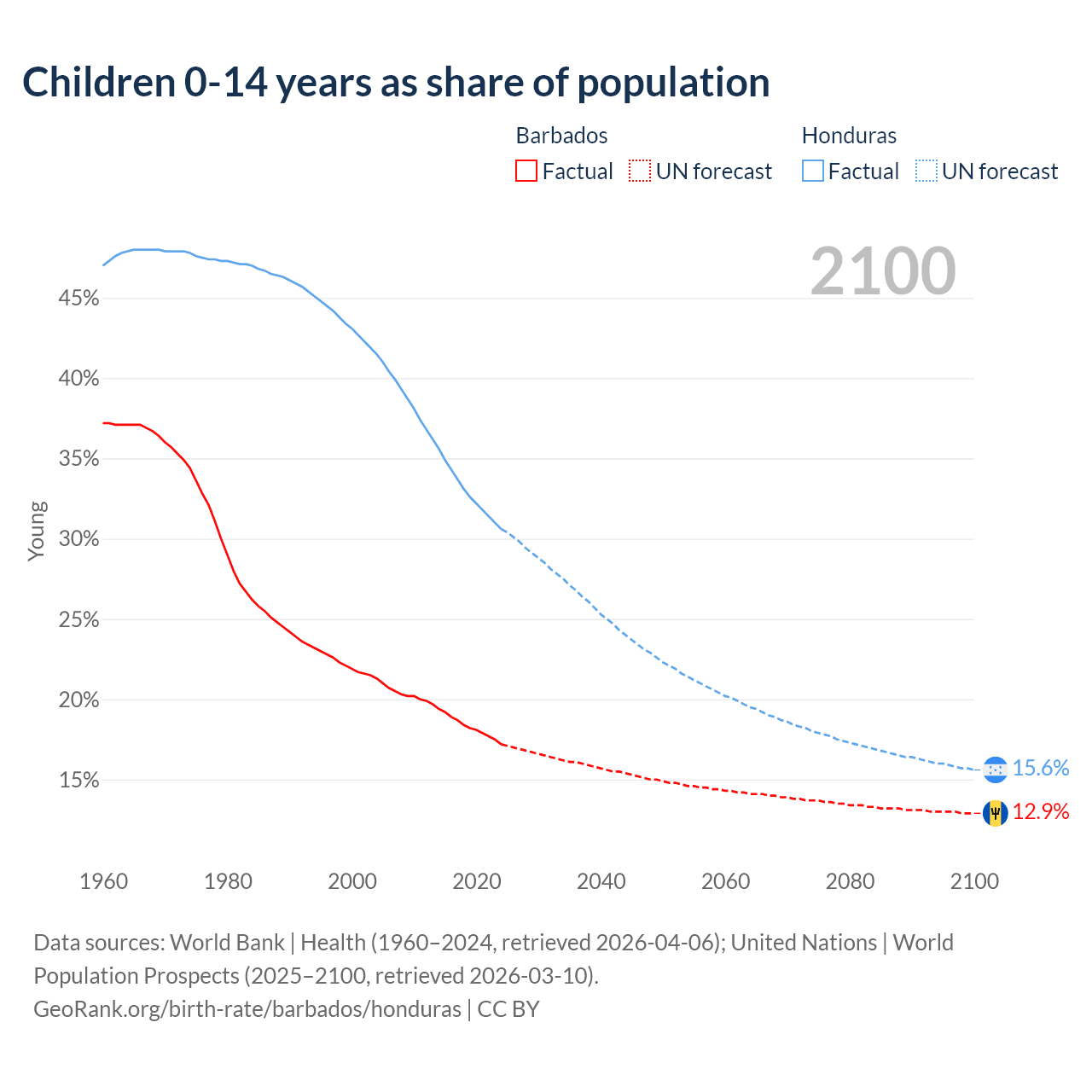 According to the latest available data on birth rates, the fertility rate in Barbados was 1.71 children per woman in 2023, compared to 2.5 in Honduras in 2023. The replacement level is considered to be 2.1 children per woman.