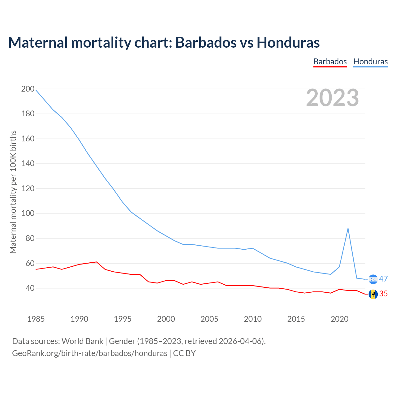 The maternal mortality rate, which is the probability of dying during childbirth or within 42 days of pregnancy termination, is 35 deaths per 100,000 live births in Barbados, compared to 47 deaths in Honduras.