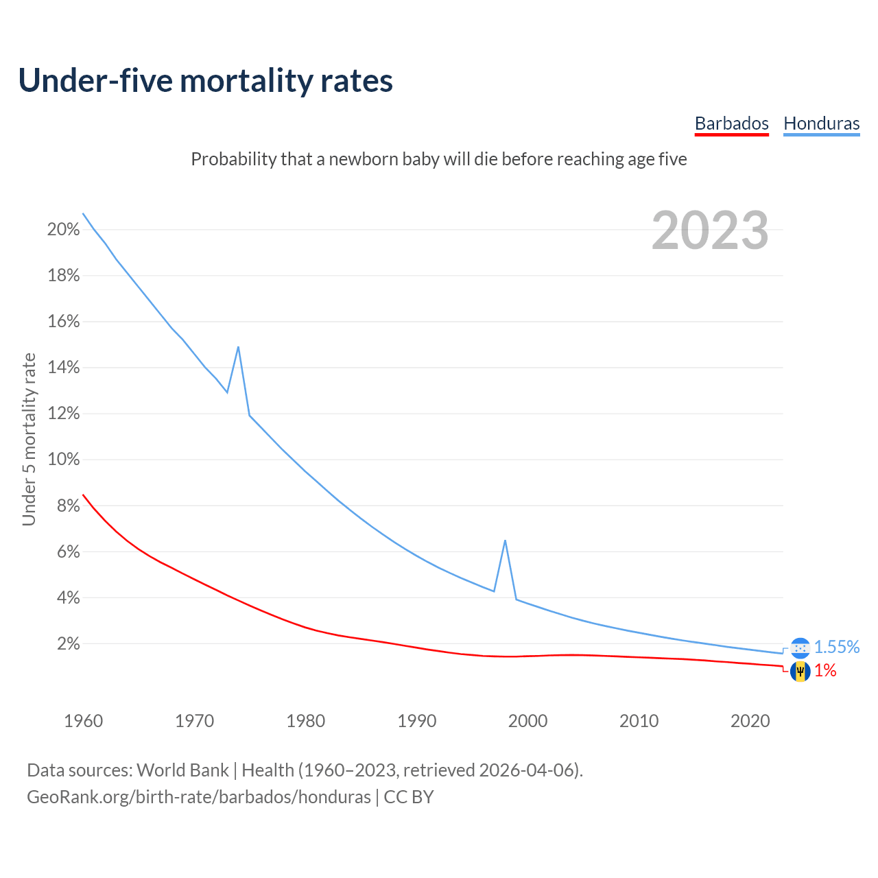 The chance that a newborn baby will die before reaching age five is 1% in Barbados and 1.55% in Honduras. Above is a chart with historical data on under-five mortality rates.