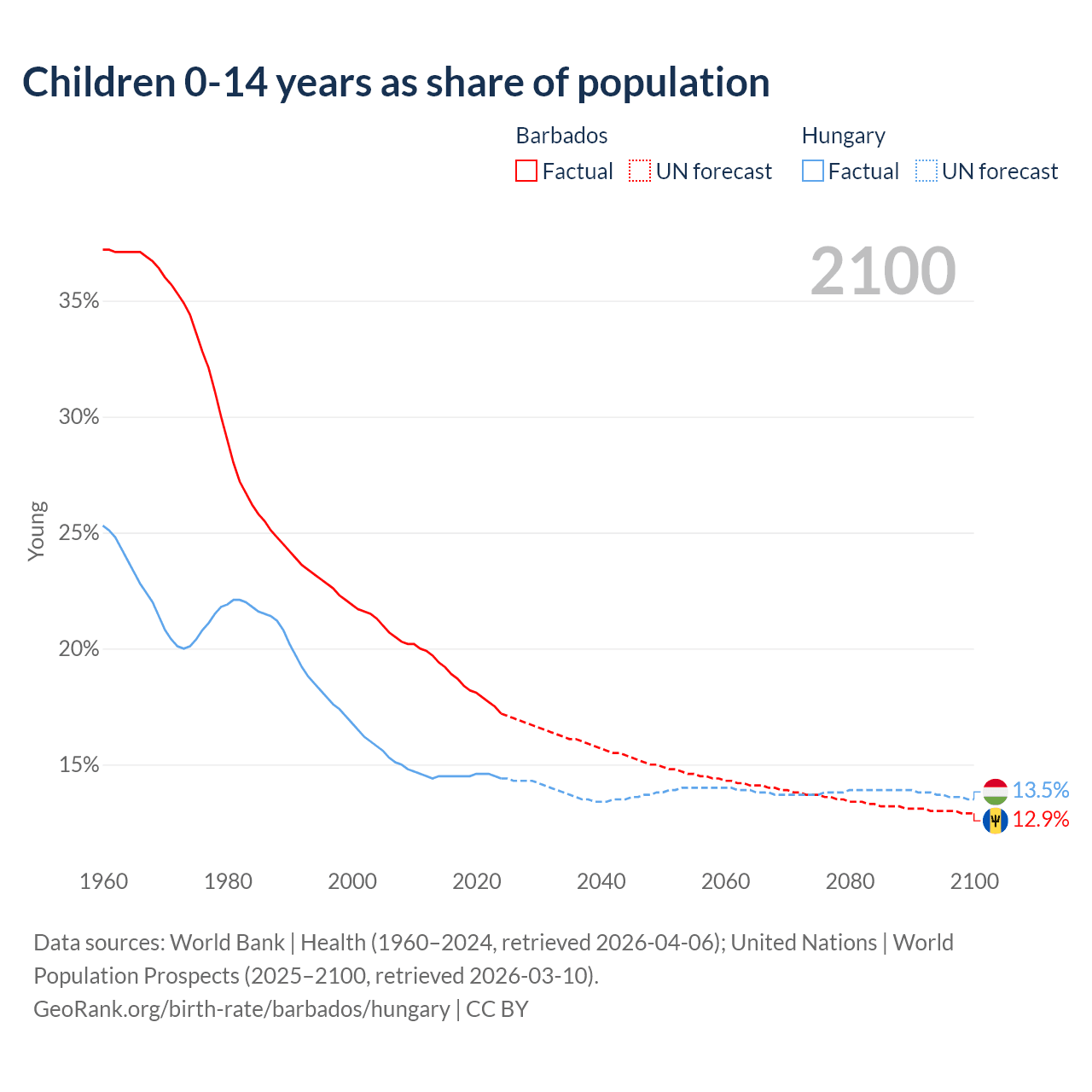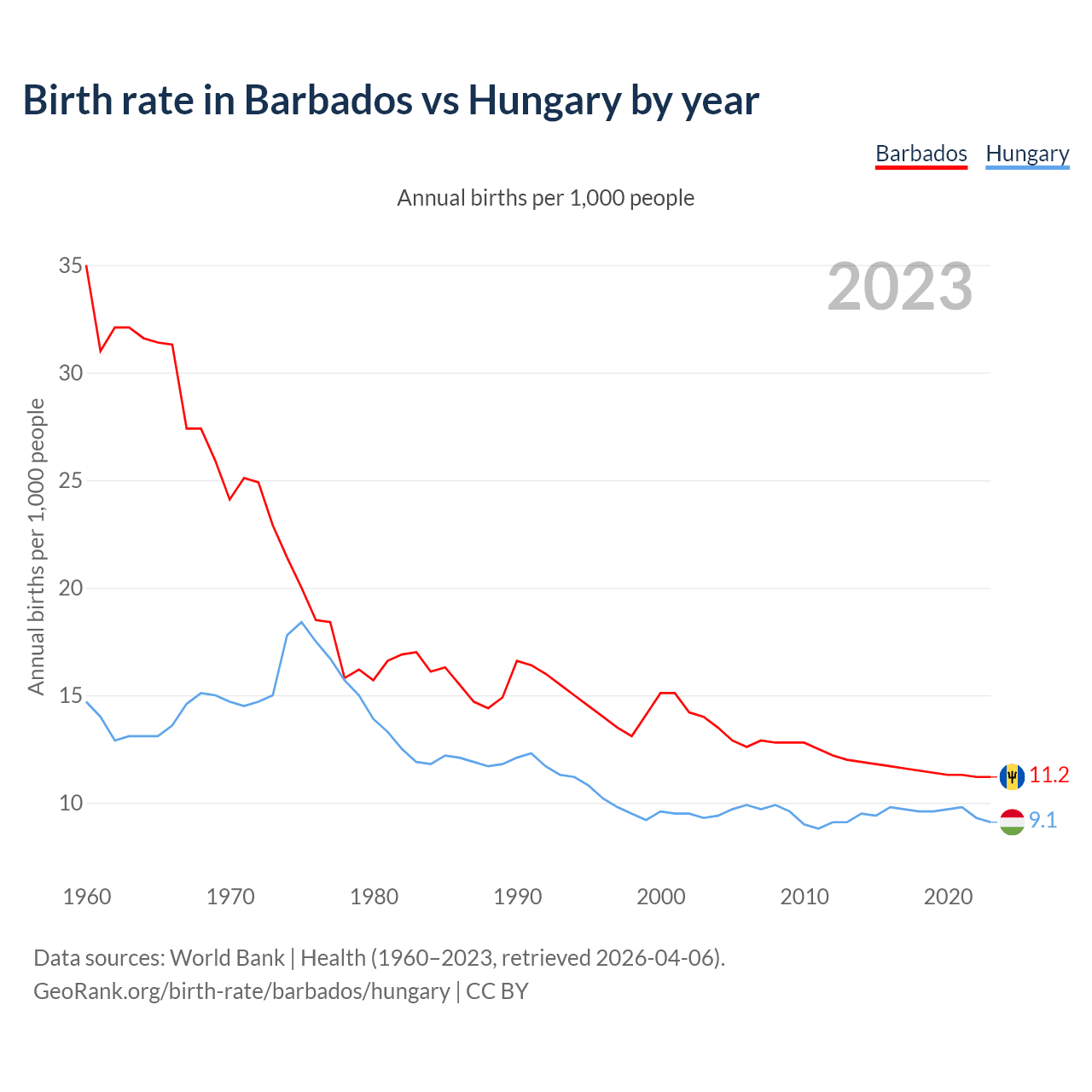 According to the latest available data on birth rates, the fertility rate in Barbados was 1.71 children per woman in 2023, compared to 1.51 in Hungary in 2023. The replacement level is considered to be 2.1 children per woman.
