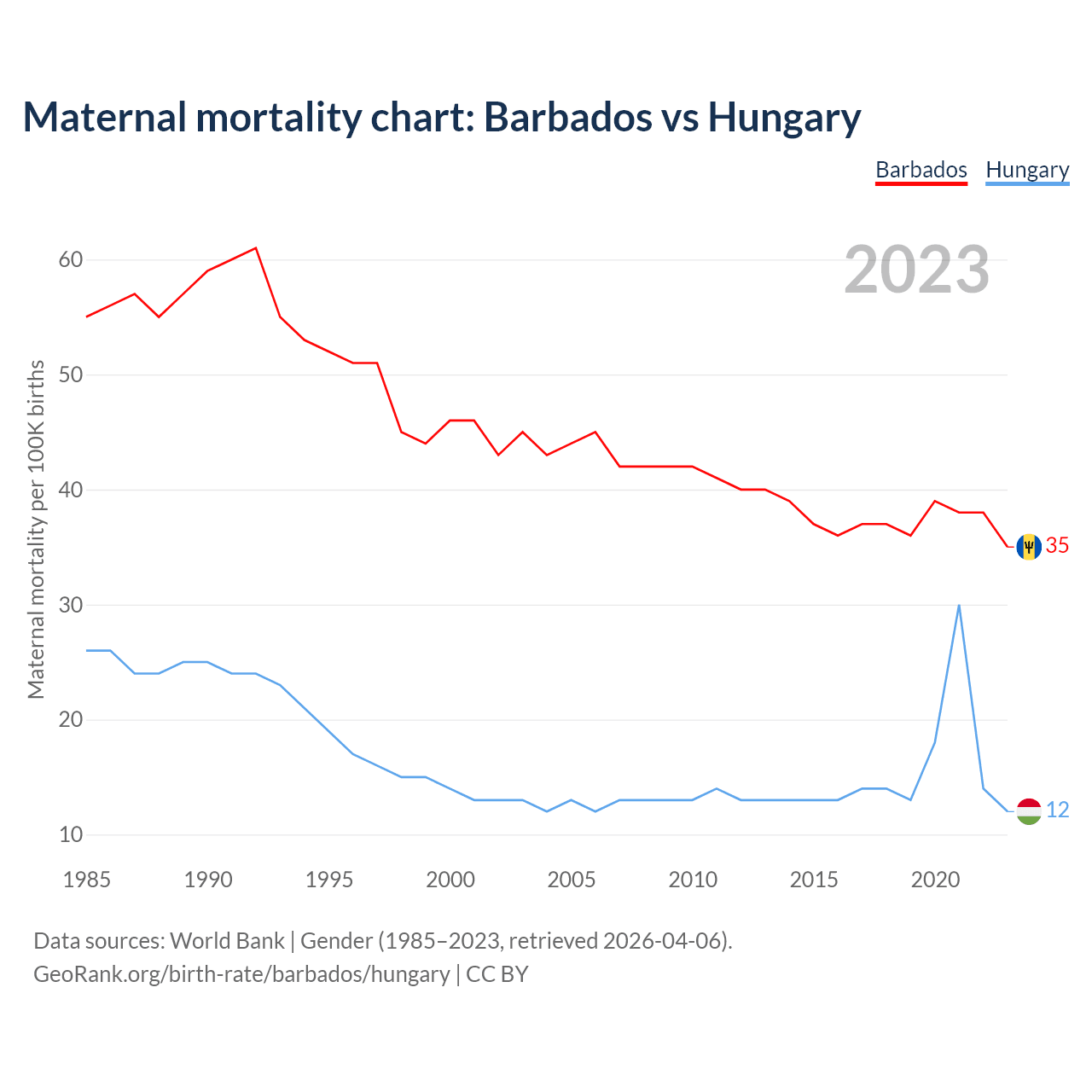 The maternal mortality rate, which is the probability of dying during childbirth or within 42 days of pregnancy termination, is 35 deaths per 100,000 live births in Barbados, compared to 12 deaths in Hungary.