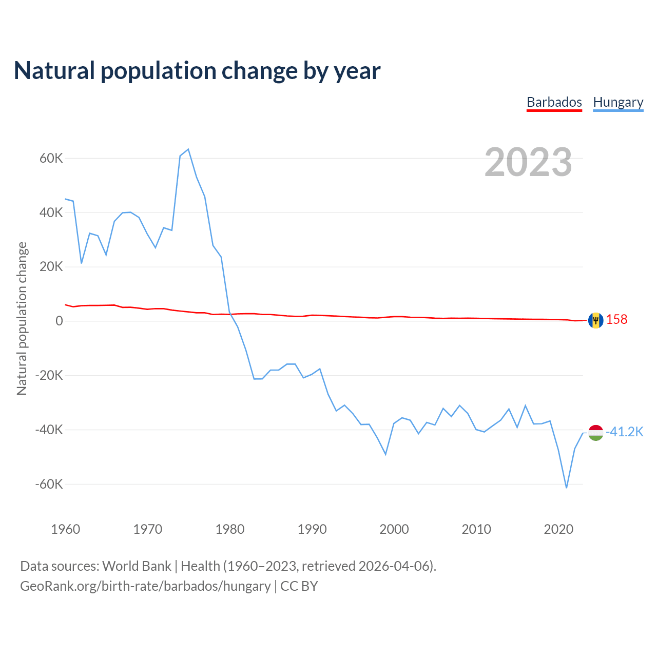 Barbados has an annual birth rate of 11.2 births per 1,000 people, compared to 9.1 for Hungary. The average number of children a woman is expected to have during her lifetime — the fertility rate, is 1.71 in Barbados and 1.51 in Hungary — 11.6% difference.