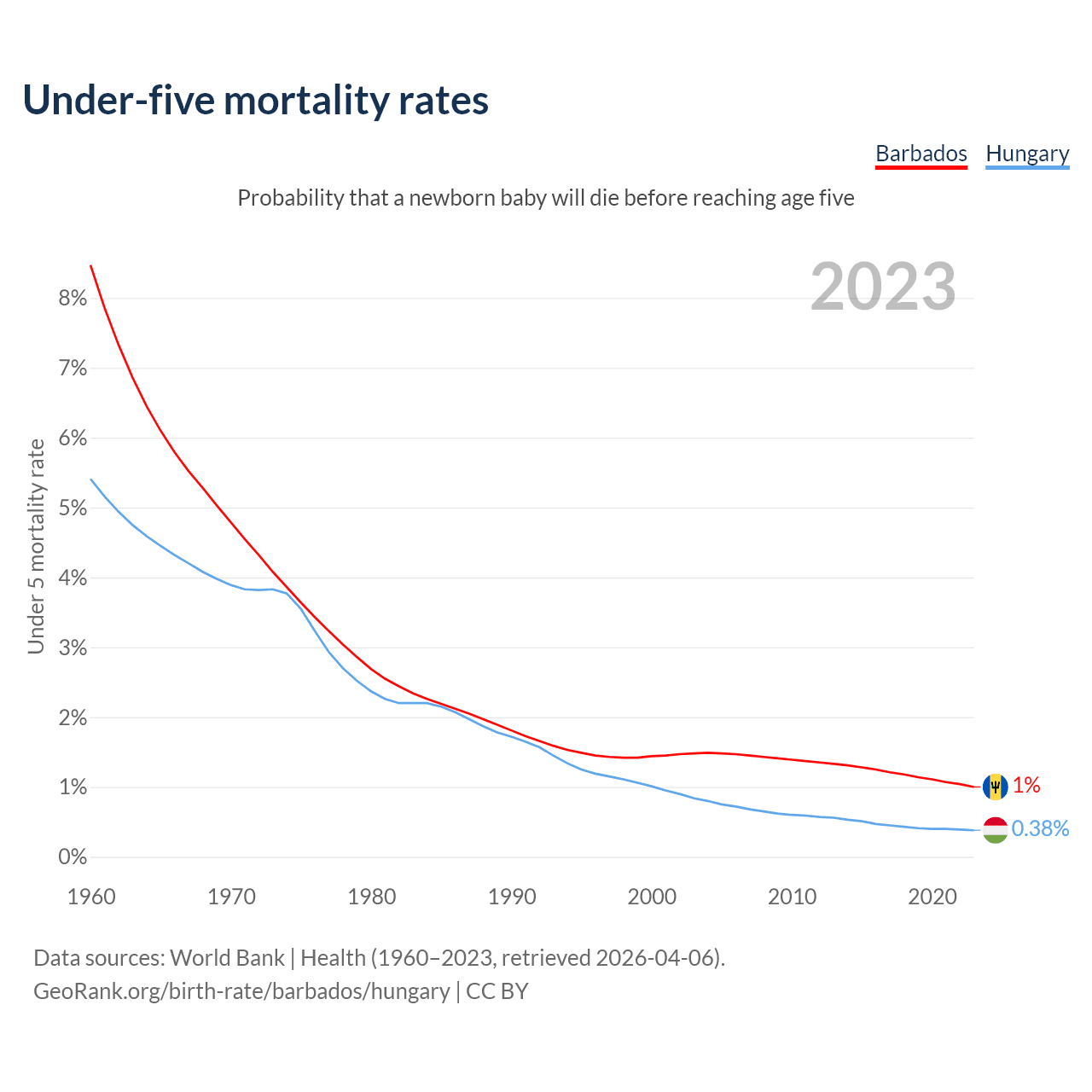 The chance that a newborn baby will die before reaching age five is 1% in Barbados and 0.38% in Hungary. Above is a chart with historical data on under-five mortality rates.