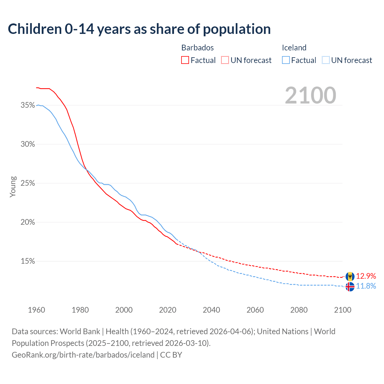 According to the latest available data on birth rates, the fertility rate in Barbados was 1.71 children per woman in 2023, compared to 1.59 in Iceland in 2023. The replacement level is considered to be 2.1 children per woman.