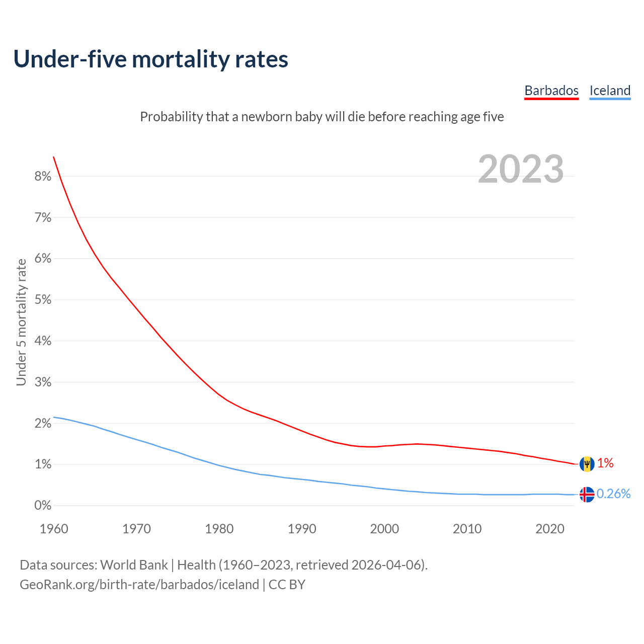 The chance that a newborn baby will die before reaching age five is 1% in Barbados and 0.26% in Iceland. Above is a chart with historical data on under-five mortality rates.