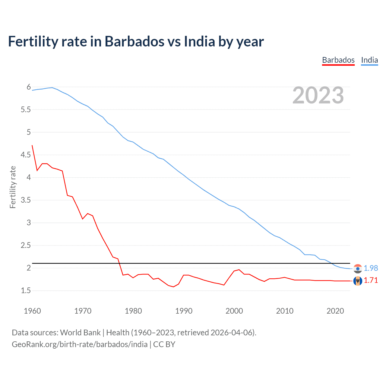 According to the latest available data on birth rates, the fertility rate in Barbados was 1.71 children per woman in 2023, compared to 1.98 in India in 2023. The replacement level is considered to be 2.1 children per woman.