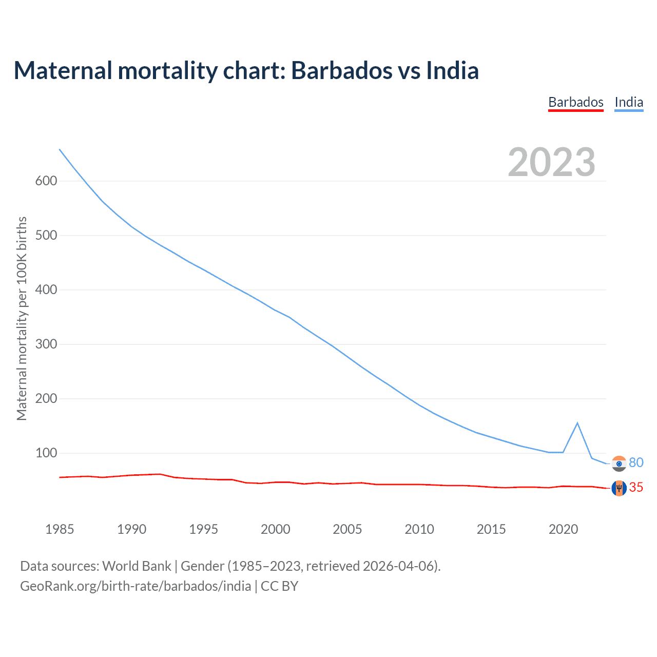 The maternal mortality rate, which is the probability of dying during childbirth or within 42 days of pregnancy termination, is 35 deaths per 100,000 live births in Barbados, compared to 80 deaths in India.