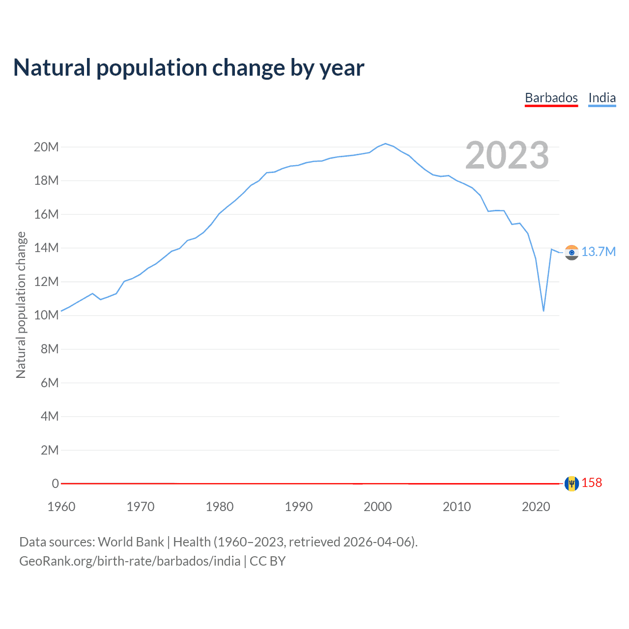Barbados has an annual birth rate of 11.2 births per 1,000 people, compared to 16.1 for India. The average number of children a woman is expected to have during her lifetime — the fertility rate, is 1.71 in Barbados and 1.98 in India — 15.6% difference.
