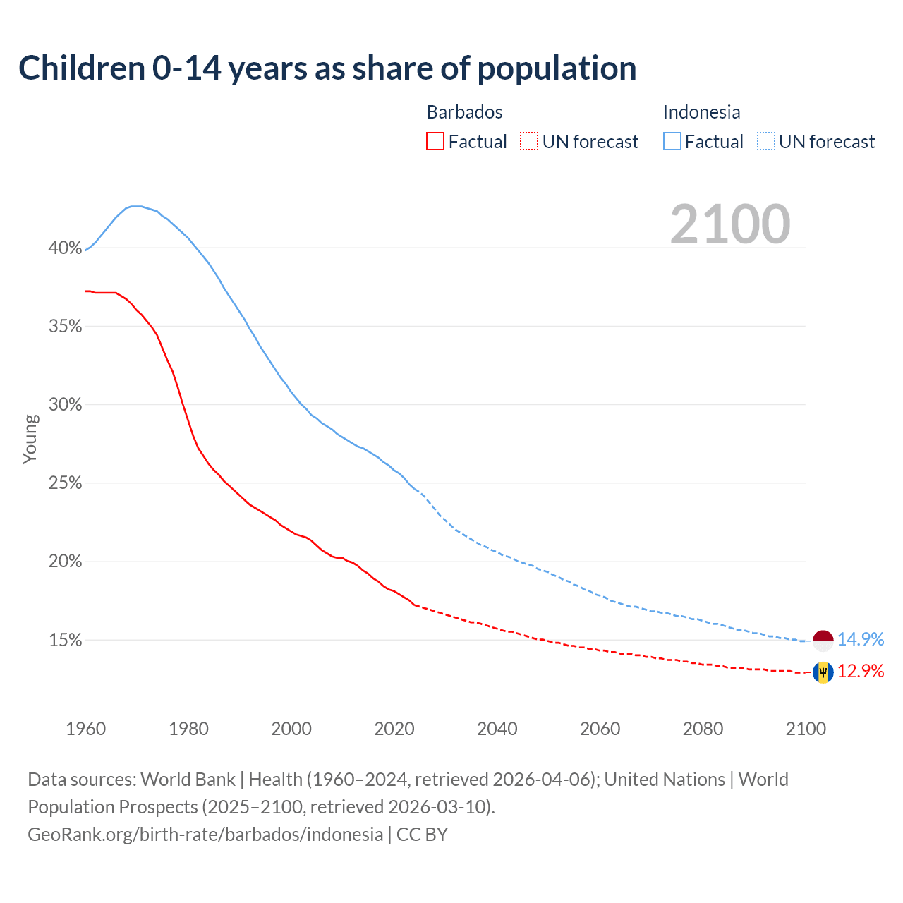 According to the latest available data on birth rates, the fertility rate in Barbados was 1.71 children per woman in 2023, compared to 2.13 in Indonesia in 2023. The replacement level is considered to be 2.1 children per woman.
