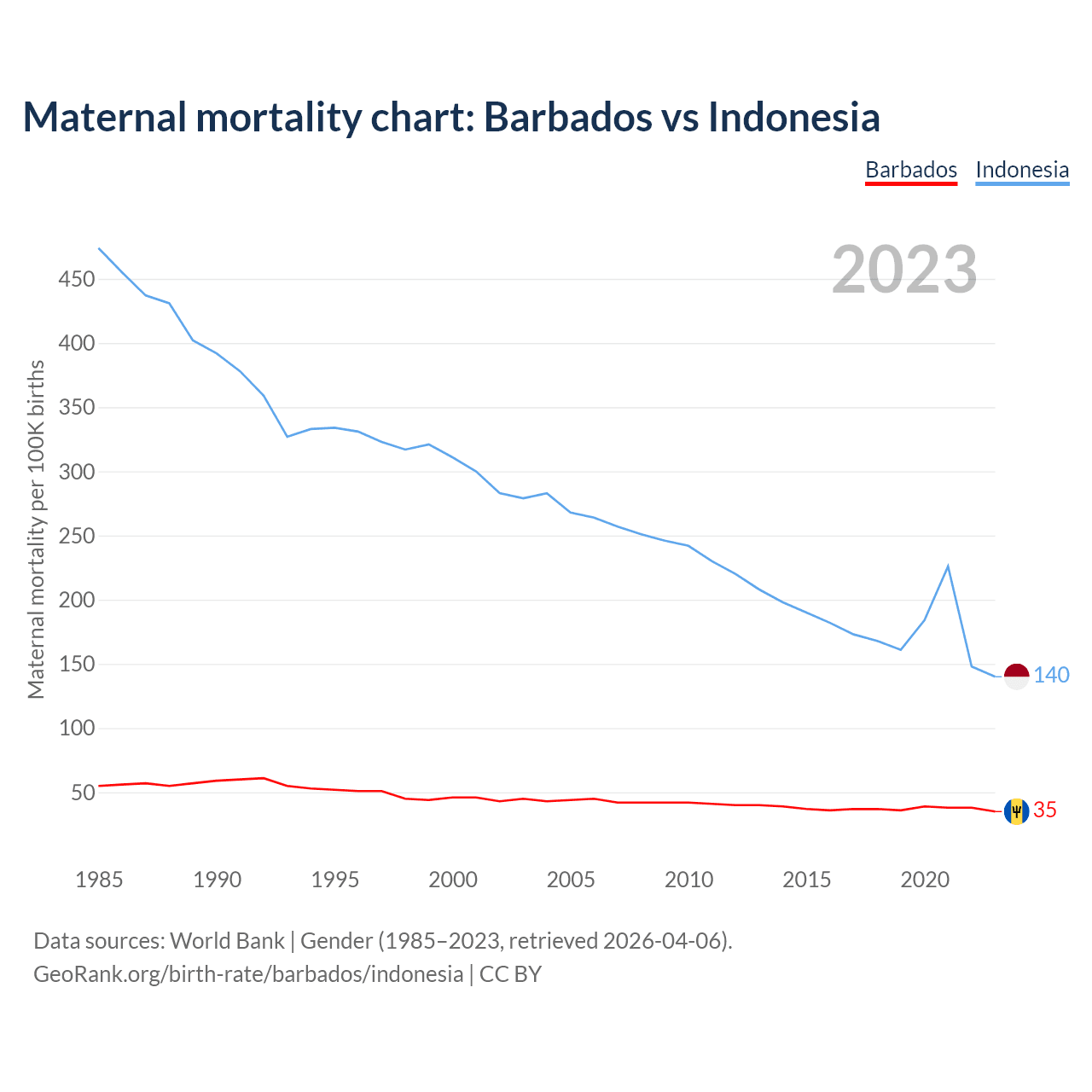 The maternal mortality rate, which is the probability of dying during childbirth or within 42 days of pregnancy termination, is 35 deaths per 100,000 live births in Barbados, compared to 140 deaths in Indonesia.