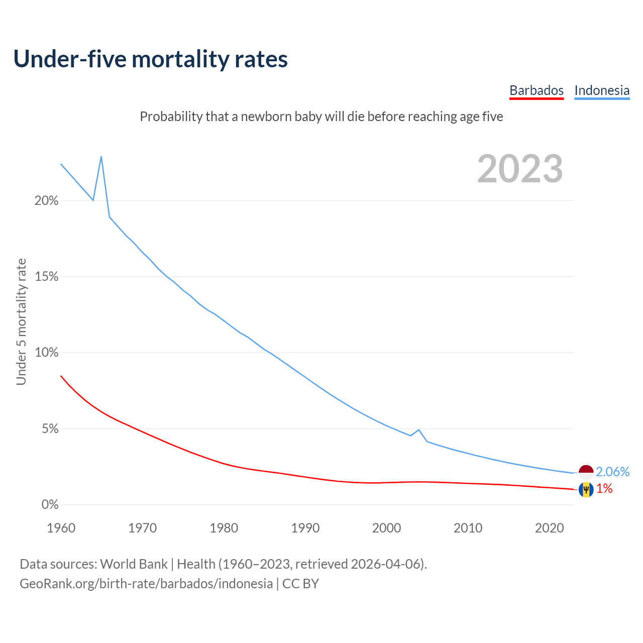 The chance that a newborn baby will die before reaching age five is 1% in Barbados and 2.06% in Indonesia. Above is a chart with historical data on under-five mortality rates.