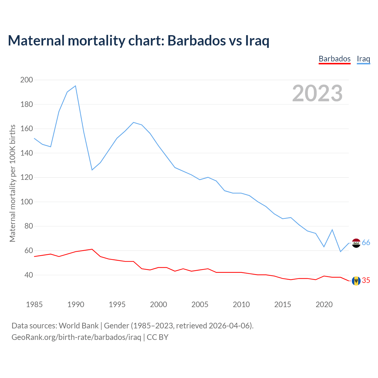 The maternal mortality rate, which is the probability of dying during childbirth or within 42 days of pregnancy termination, is 35 deaths per 100,000 live births in Barbados, compared to 66 deaths in Iraq.