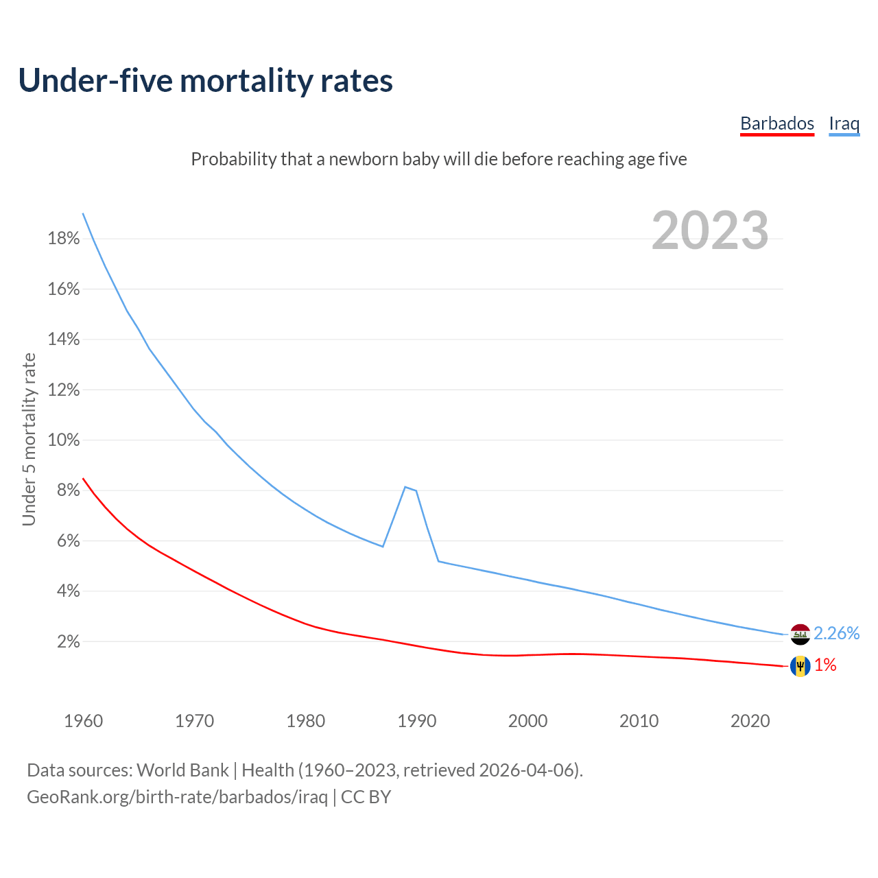 The chance that a newborn baby will die before reaching age five is 1% in Barbados and 2.26% in Iraq. Above is a chart with historical data on under-five mortality rates.