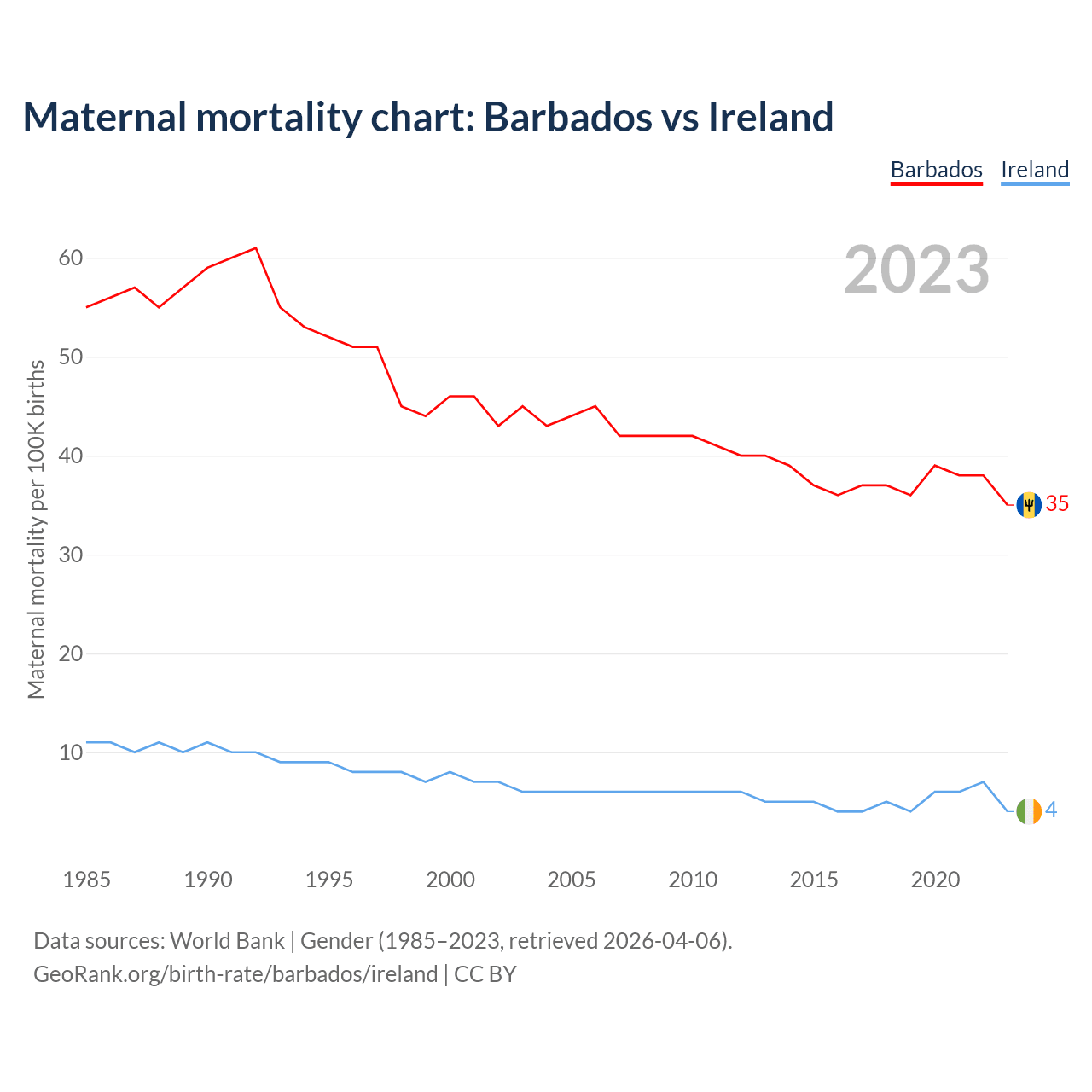 The maternal mortality rate, which is the probability of dying during childbirth or within 42 days of pregnancy termination, is 35 deaths per 100,000 live births in Barbados, compared to 4 deaths in Ireland.
