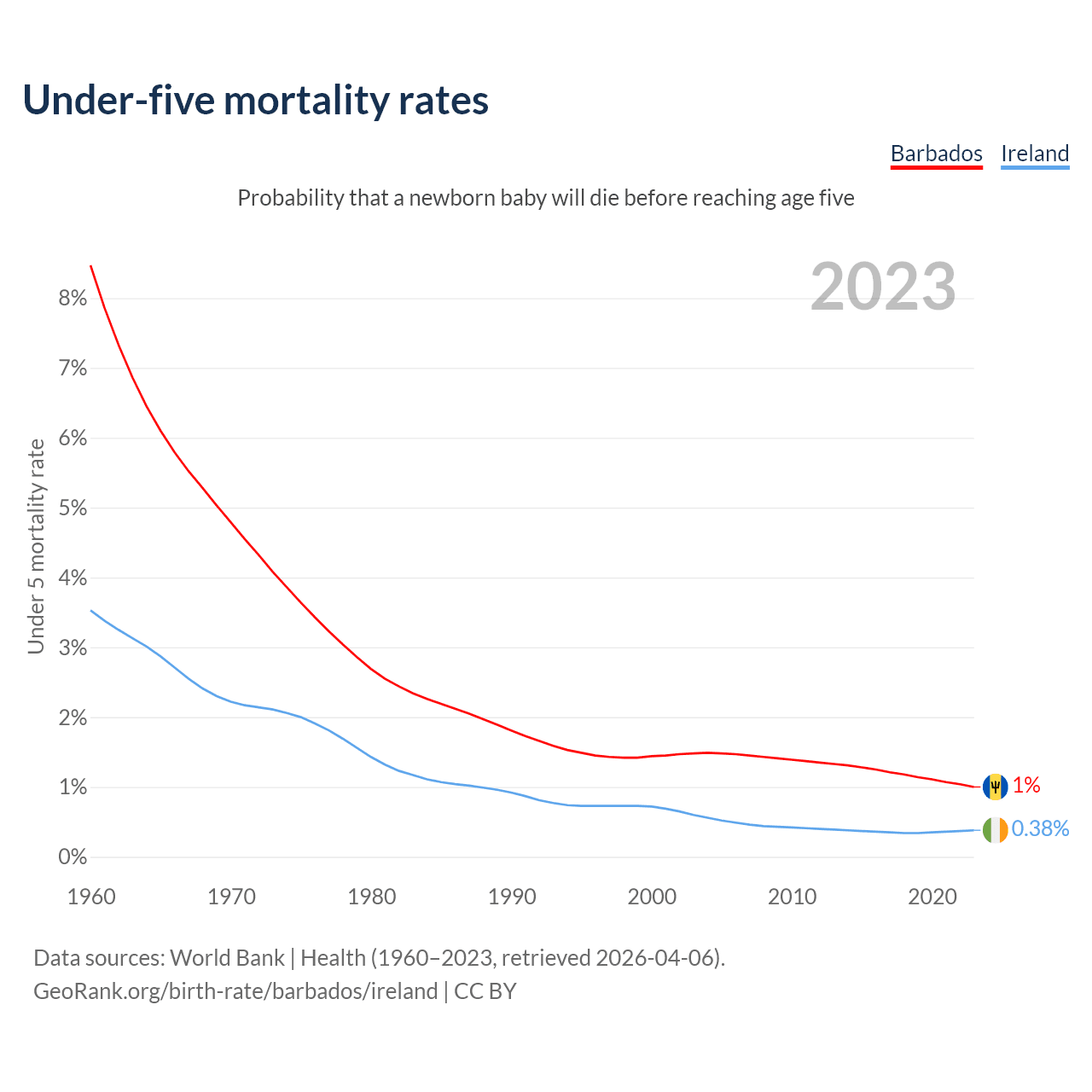 The chance that a newborn baby will die before reaching age five is 1% in Barbados and 0.38% in Ireland. Above is a chart with historical data on under-five mortality rates.